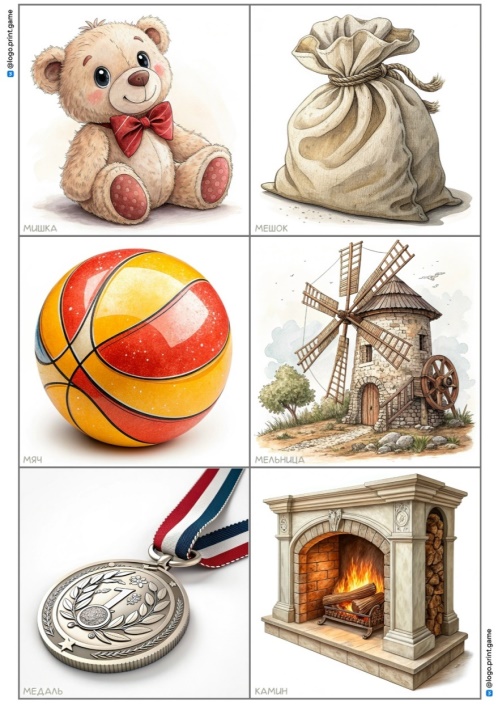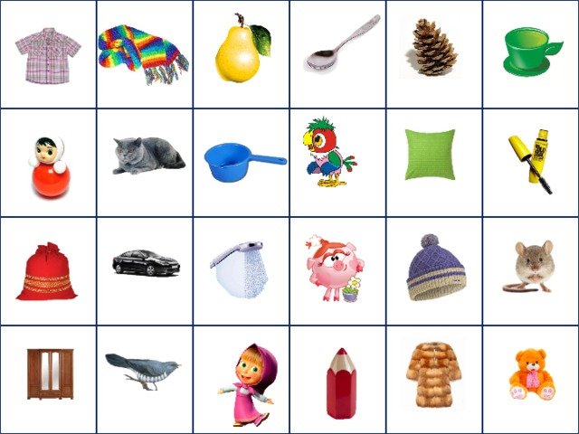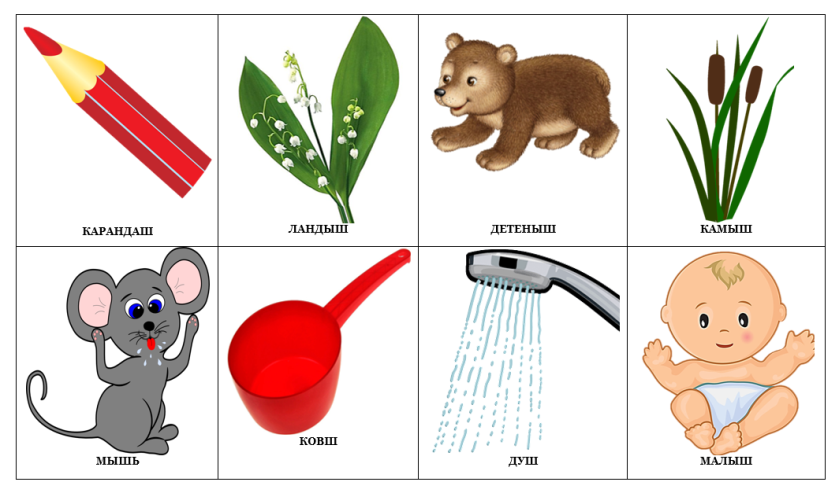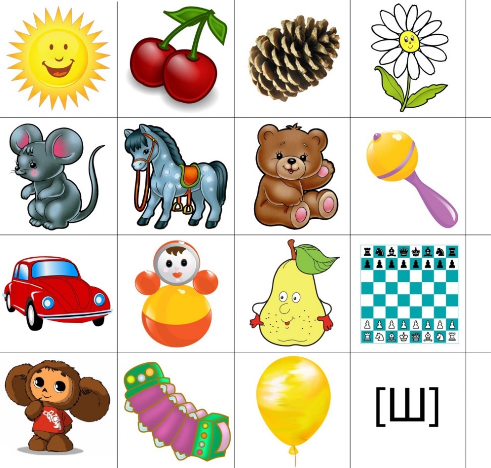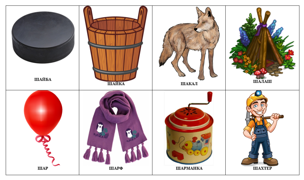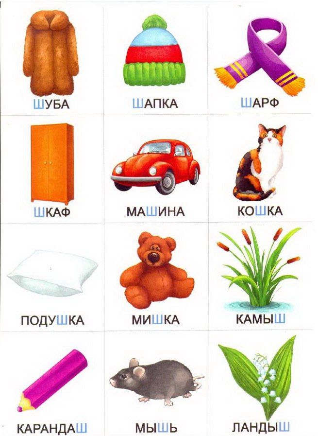 (Слова: шарф, шапка, шалаш, шахматы, шар, груша, лошадь, Нюша, шайба, шишка, шиповник, шина, машина, камыши, уши, шуба, шуруп, шорты, мешок, малыш, ландыш, ковш, душ, карандаш, мышь, шкаф, кошка, подушка, неваляшка, гармошка, Чебурашка, мишка, погремушка, ромашка, вишня, шляпа).