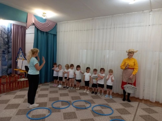 Инструктор.Здравствуйте, козлятки. Очень хорошо, что вы пришли на занятие. Вашей маме нужно сходить в огород за капустой. Давайте её отпустим, а сами позанимаемся. Мама Коза уходит в огород.