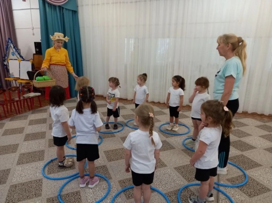 Оборудование: Костюм Козы и Волка для взрослого, широкая и узкая дорожки одинаковой длины, кочаны (игрушечные) и обручи по количеству детей, музыкальное сопровождение.