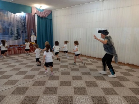 Инструктор надевает жилетку и маску волка. Под музыку козлята гуляют по залу. Когда музыка звучит громче, Волк бегает за козлятами и пытается их поймать. Козлята прячутся от Волка в домике (садятся на стульчике, приготовленные заранее по количеству детей)