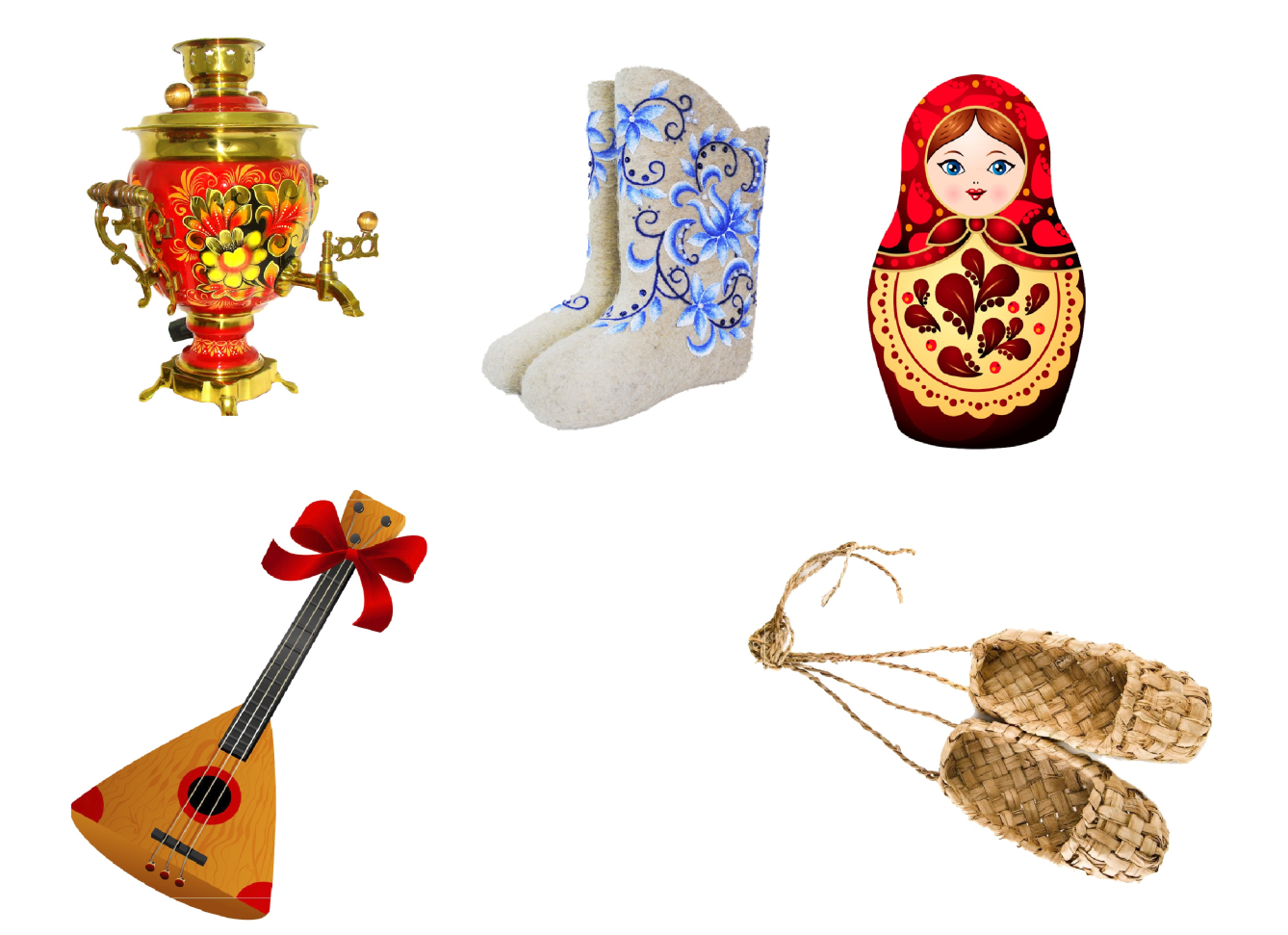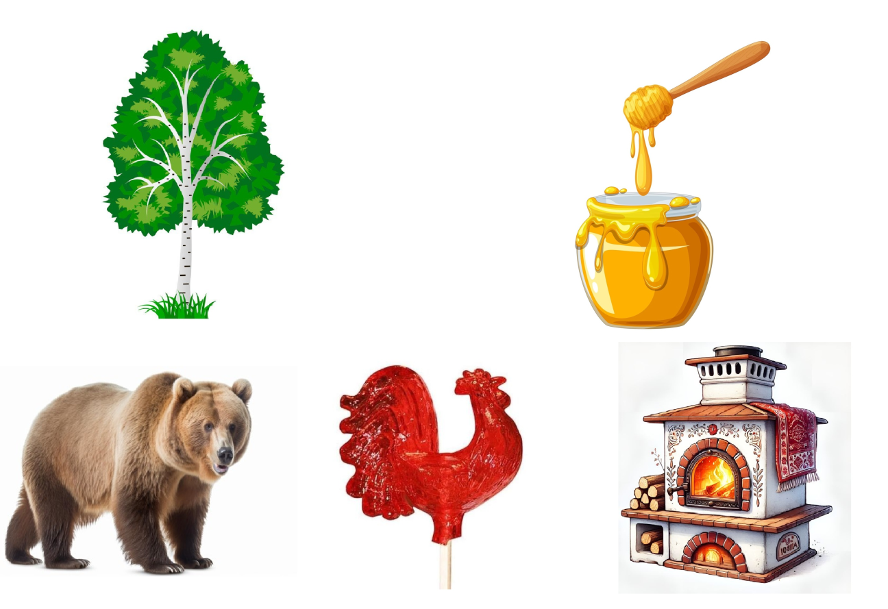 Слова: герб, гимн, березе, печь, петушок, мед, медведь, флаг, карта, Москва, матрешка, лапти, валенки, самовар, балалайка.