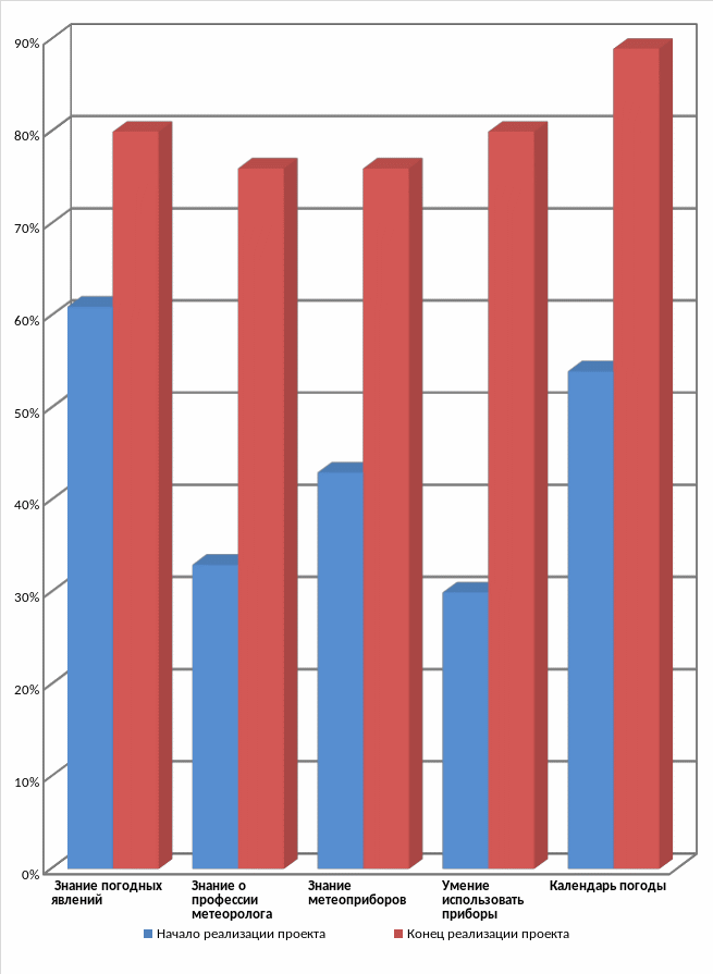 В начале реализации проекта 57% детей не знали метеоприборов, кроме термометра, и не умели ими пользоваться. В конце реализации проекта 89% детей показали высокий уровень знаний, умений и навыков. Я считают, что это произошло потому, что тема проекта оказалась интересна дошкольникам, особенно эксперименты и практические работы.