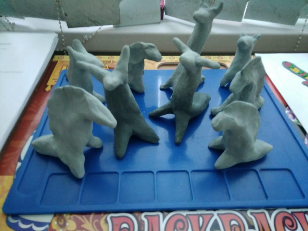 Маленький кусочек глины делится на 2 части (для козленка на 3).