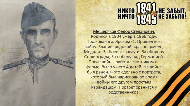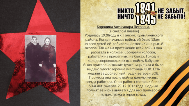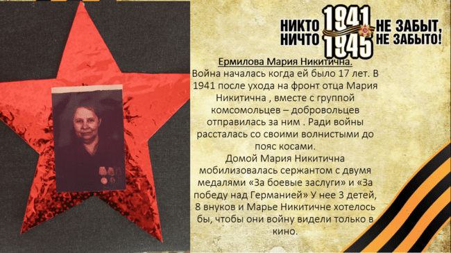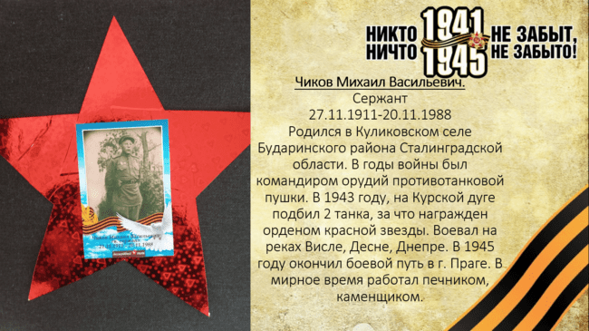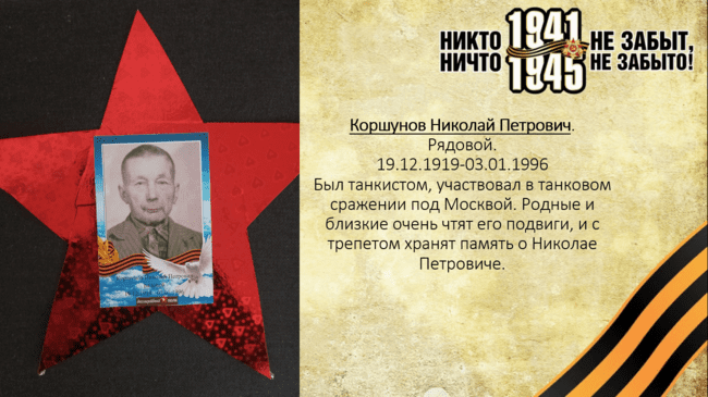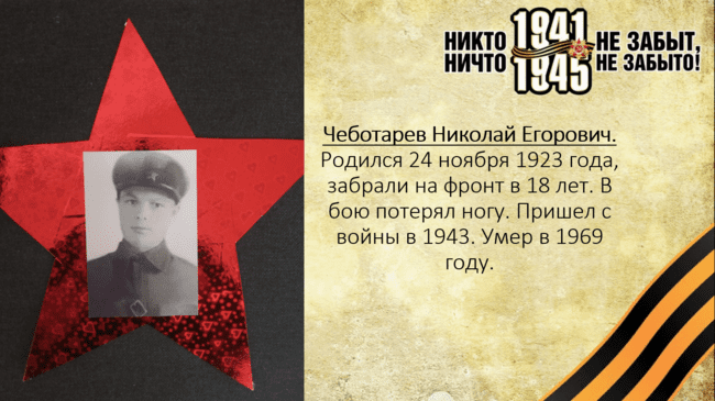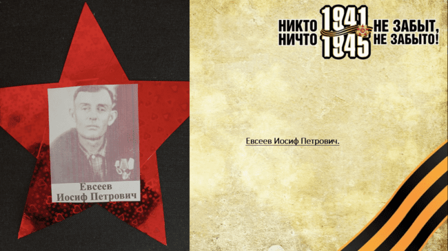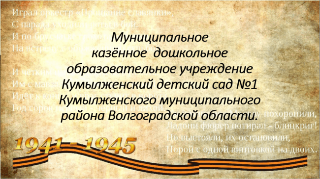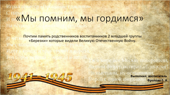 14.05.2024 "Мы помним, мы гордимся" Принять участие в этом конкурсе Описание конкурса Список всех конкурсов Евгения Алексеевна Фролова МКДОУ Кумылженский детский сад № 1 Кумылженского Муниципального района Волгоградской области Конкурсная работа Свидетельство участника экспертного совета жюри Свидетельство можно заказать сразу, как Вы оставите не менее 3 объективных комментариев в этом разделе сайта. Узнать подробнее Презентация "Алексей Маресьев - летчик-герой ВОВ." Ваша Победа в наших сердцах! У вас недостаточно прав для добавления комментариев.Чтобы оставлять комментарии, вам необходимо авторизоваться на сайте. Если у вас еще нет учетной записи на нашем сайте, предлагаем зарегистрироваться. Это займет не более 5 минут.