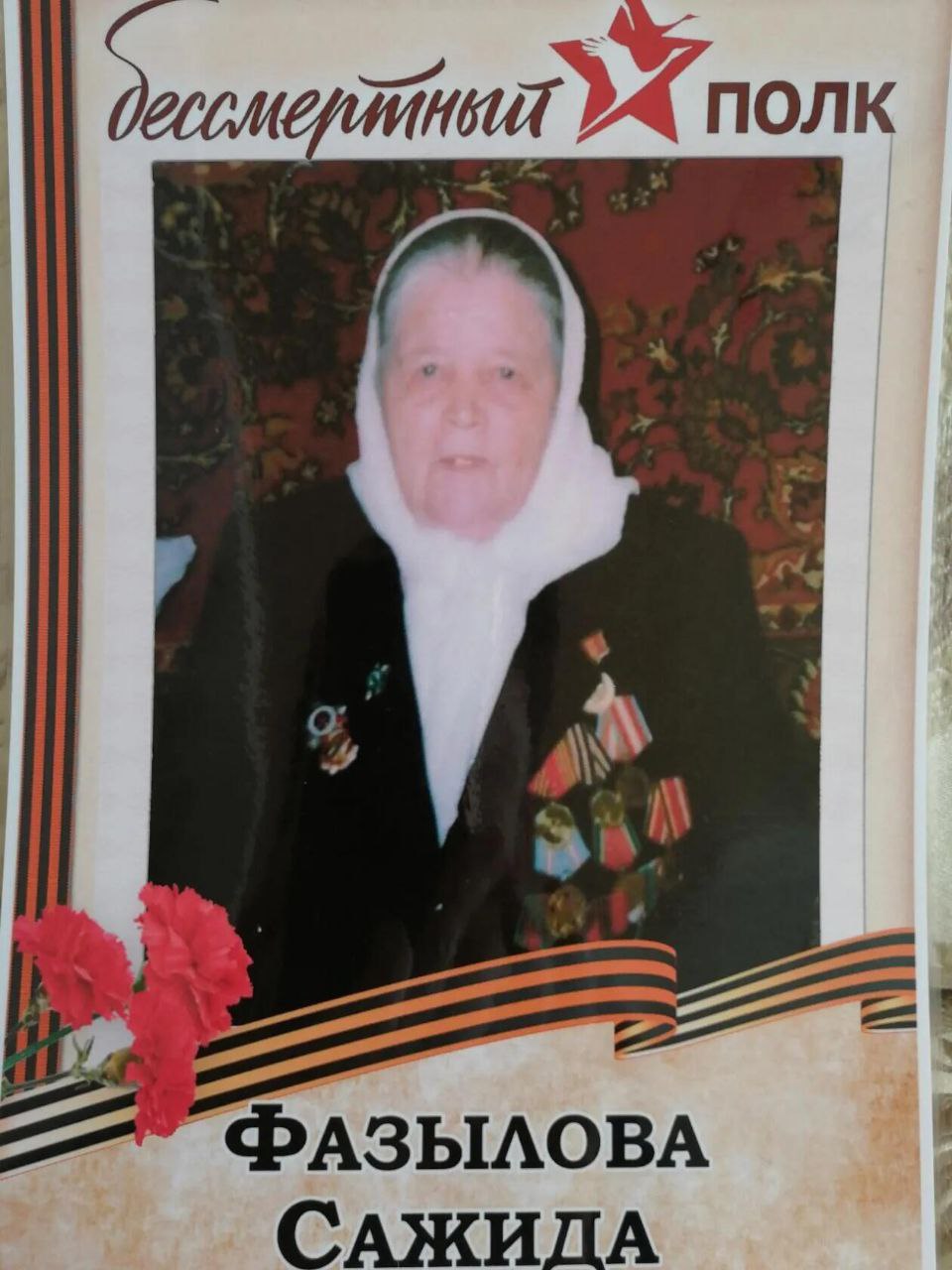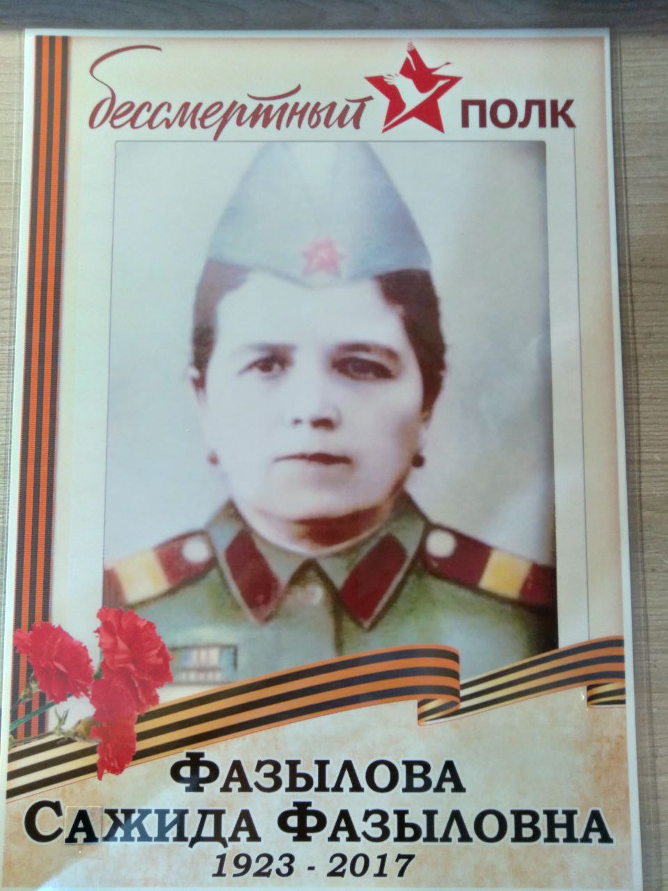 Расскажу я своей тете, участнице Великой Отечественной войны Сажиде Фазыловне Фазыловой. Родилась она в деревне Гайны 28 ноября 1923 года, в семье колхозника Фазыла Фаршатова, в которой было шесть девочек. Старшую дочь Сажиду отец хотел видеть учительницей. Поэтому после окончания семилетней школы в Гайнах её послали в Каяновское педучилище Пермской области, где готовили учителей начальных классов для национальных школ.