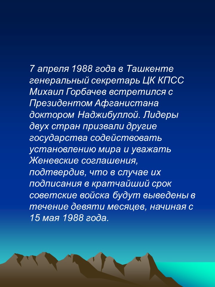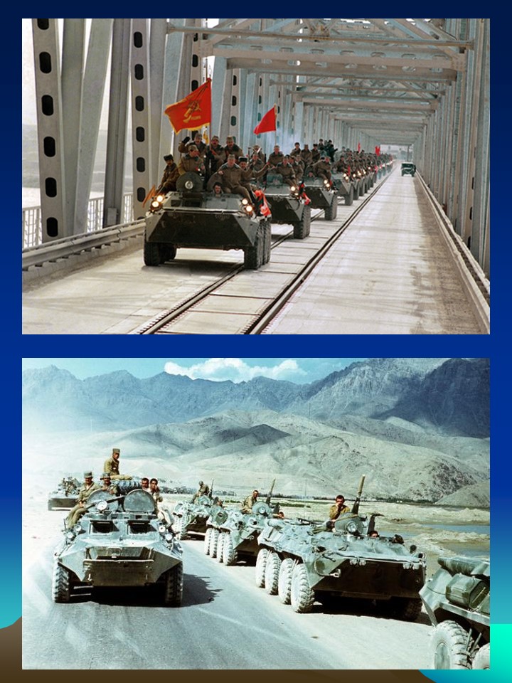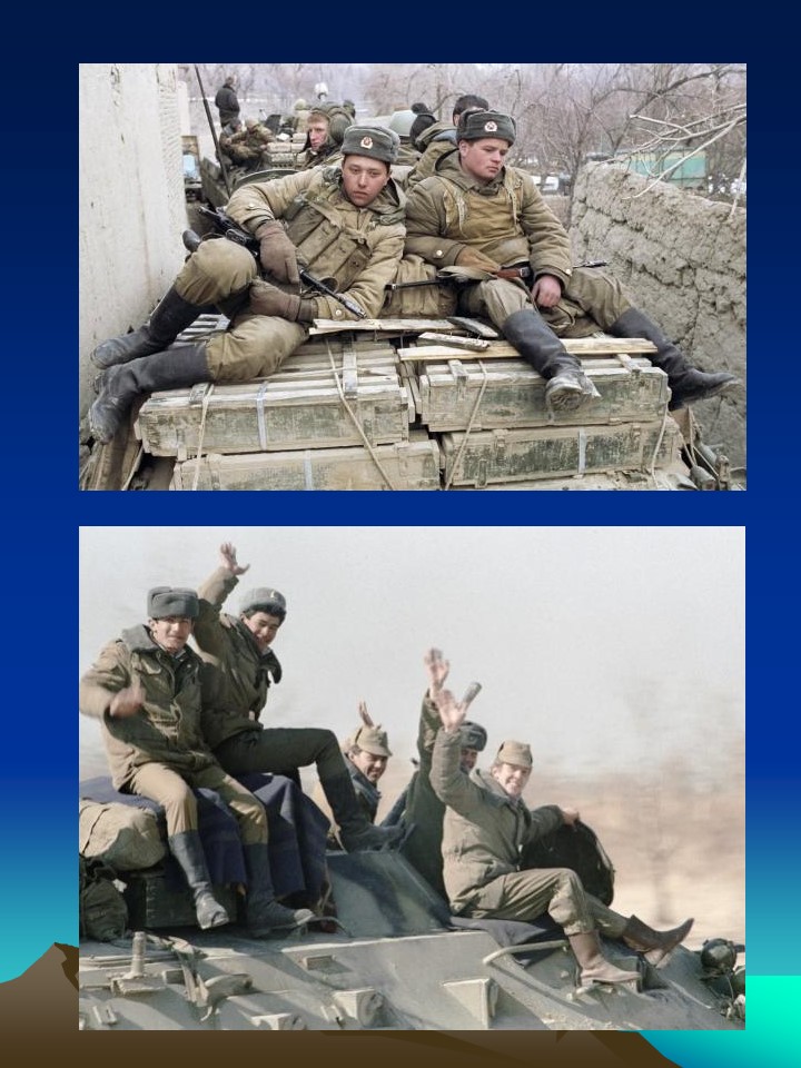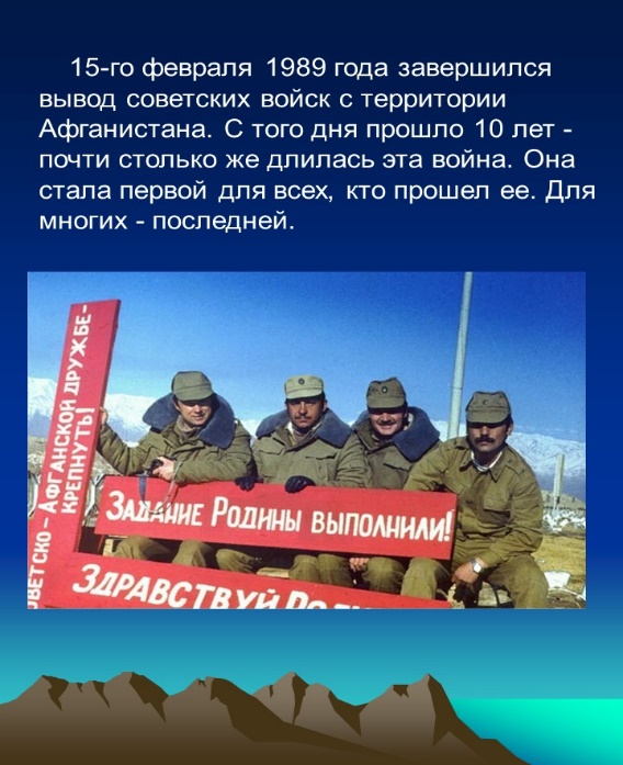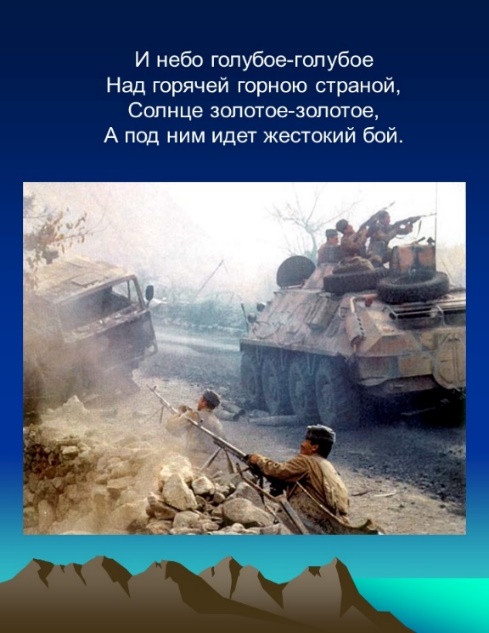 Учитель: Война в Афганистане длилась 9 лет 1 месяц и 18 дней. Через эту войну прошло 550 тысяч советских солдат и офицеров. 72 человека получили звание Героя Советского Союза. Свыше 15 тысяч наших воинов погибли на чужой земле, 6 тысяч скончались впоследствии от ран и болезней, 311 человек пропали без вести. Это были самые большие потери Советской Армии со времён Великой Отечественной войны. В ту пору мы узнали, как опасна профессия вертолётчика, что слово «дух» может означать не только что-то возвышенное, но и немытое, бородатое существо с «калашом» наперевес. Военный жаргон обогатился новыми терминами: «зелёнка», «вертушка», «груз 300», «груз 200». Память о войне по-прежнему болью отзывается в людских сердцах. Афганистан. Это слово у многих вызывает тревогу, боль и слёзы. Почти 10 лет звучало тревожное слово Афганистан! Но войны должны кончаться. Иначе в них нет смысла. Слышишь жуткое слово – война.