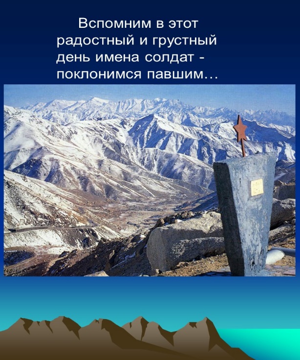 Учитель: Ровно 35 лет назад закончилась эта война. А 15 февраля стал днем - символом, днем Памяти. Каждый год в этот день собираются все бывшие афганцы и участники других горячих точек, хотя слово бывшие здесь, наверное, не подходит. Потому что всё это время жива память, боль и горечь тех, кто там был, и тех, кто ждал здесь. После вывода войск из Афганистана многим казалось, что самое страшное позади. Тысячи матерей вздохнули с облегчением. Но потом начался Карабах, Абхазия, Таджикистан, Чечня… Сегодняшние мальчишки продолжают эстафету Мужества. И Чечня, как Афганистан, стала многострадальной землей. Здесь наши солдаты, подавая руку дружбы и спасая судьбу человечества, порой отдавали свои, совсем еще юные жизни ради жизни на земле. А теперь ещё спецоперация на Украине, где также гибнут наши парни и девушки.