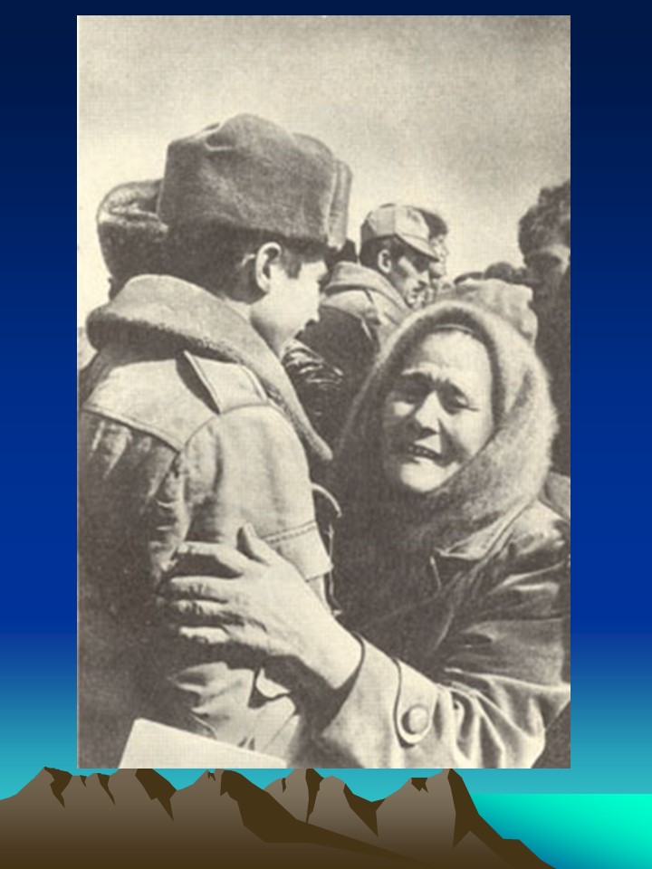 Учитель:Главный из итогов войны такой: нам повезло в людях. За всю войну в пограничных войсках не было ни одного дезертира, предателя, ни одного раненого или погибшего товарища не оставили противнику. Десятки тысяч солдат и офицеров, прошедших Афганистан, честно и до конца выполнили свой воинский долг. Афганцы – настоящие солдаты в самом высоком значении этого слова. Честь им, слава и низкий поклон.