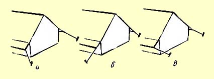 При забивке колышков нужно придавать им наклон в сторону от палатки, а не к ней. Иначе оттяжки будут легко соскакивать. При натягивании коньковых оттяжек через опорные стойки надо следить, чтобы конек палатки, стойки и колышек, за который крепится оттяжка, были на одной прямой. Иначе палатка будет - неустойчивой. Направление угловых оттяжек на крыльях палатки не должно совпадать с продолжением одного из краев бокового ската палатки (рис.).