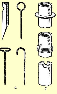 Целесообразно не вырубать на каждом биваке новые колышки, а изготовить себе комплект колышков из дюралюминиевых уголков или тонкого металлического прута диаметром 4-5 мм (рис., а).