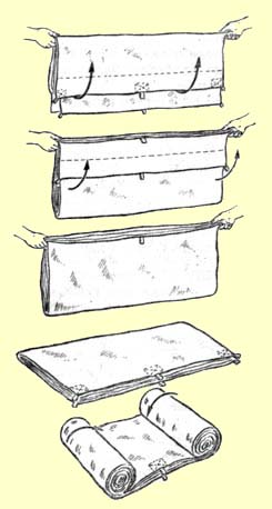 Способ первый, когда палатка используется как мягкая прокладка, которую кладут в рюкзак к спине. Два человека берут палатку за проушины на коньке и держат на весу. Затем берут проушины на углах правого или левого крыльев и складывают вместе с проушинами конька (крыло палатки вытянулось на весу вдоль конька). После этого с ними соединяют проушины, укрепленные по углам пола палатки с того же бока, что и крыло. Все оттяжки забрасывают в середину между коньком и крылом палатки, заднюю стенку и полотнища входа заправляют внутрь, складки по возможности расправляют. Потом проделывают то же самое с другим боком палатки также на весу. Затем палатку кладут на землю и разглаживают складки. После этого она напоминает что-то вроде многослойной ковровой дорожки. Теперь палатку скатывают с двух сторон в два тугих валика. В таком виде ее помещают в рюкзак, чтобы валики стояли вертикально. Два тугих, но в то же время не жестких валика придают рюкзаку удобную для переноски форму. Особенно хороша такая укладка рюкзака в том случае, если в него помещают какой-то неудобный груз, вроде бидона с маслом или кастрюли и ведра для варки пищи. Два палаточных валика позволяют распереть бидон или ведро так, чтобы они не смещались при ходьбе.