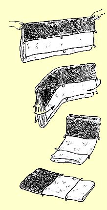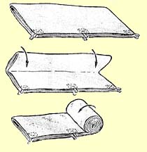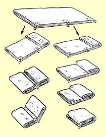 Часто бывает, что у палатки намокают только боковые скаты, а пол остается сухим. Поэтому если не удается просушить палатку при свертывании лагеря и нет надежды сделать это вечером, при разбивке бивака, надо постараться уложить ее так, чтобы пол как можно меньше соприкасался с намокшими скатами. Ни один из трех описанных выше способов для этого не годится. Способ укладки, который можно порекомендовать на этот случай, дает довольно громоздкую упаковку, но лучшую предложить трудно. Палатку берут с двух сторон за середину пола и натягивают на весу, как раньше делали с коньком палатки. Отодвигают свисающие вниз части палатки вправо или влево и по возможности расправляют их. Потом складывают палатку пополам по ширине. Дно палатки при этом не будет касаться намокших частей. Затем расправляют образовавшиеся складки и складывают её таким образом еще раз. Теперь можно скрутить палатку с одного или с двух концов или сложить несколько раз.