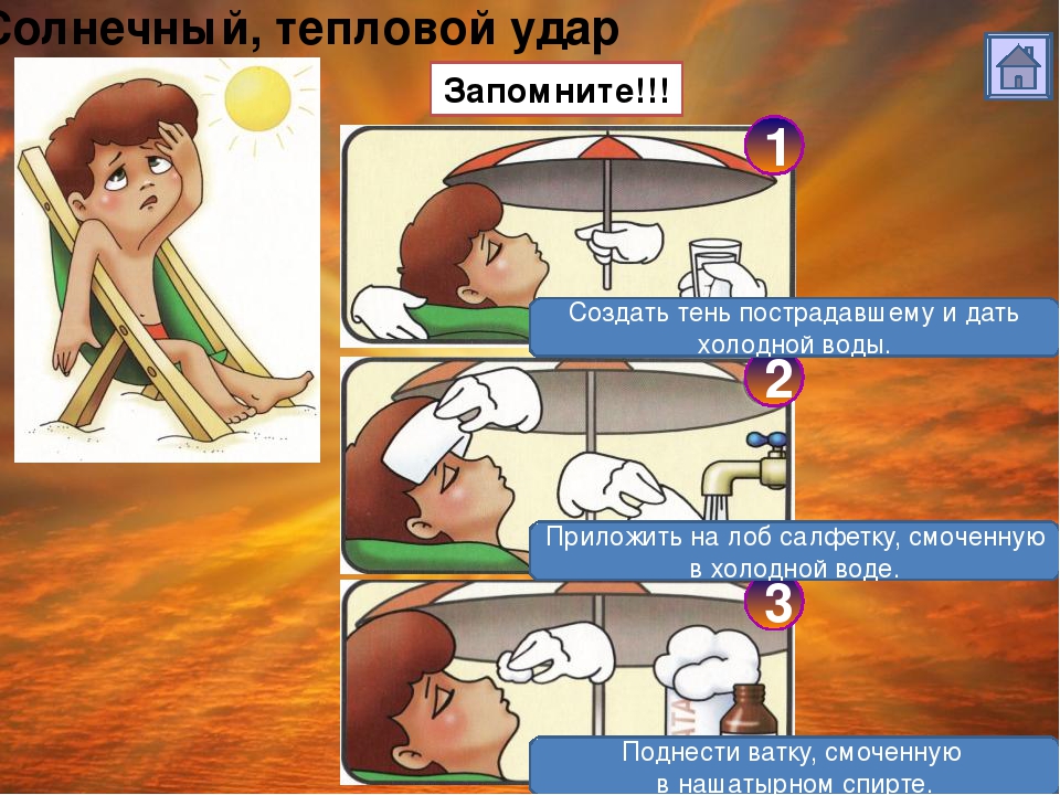 Тепловой и солнечный удар схожи по своим проявлениям, и это естественно: оба они представляют болезненную реакцию на перегревание организма. Солнечным ударом называется перегревание, возникшее из-за прямого воздействия солнечных лучей, а тепловым — вне такого воздействия: например, в жаркую, душную погоду, особенно перед грозой (когда «парит»), в густом лесу сильно нагревается застойный воздух, и, хотя группа движется в тени деревьев, у кого-то из туристов может произойти опасное перегревание организма. Обычные симптомы развивающегося солнечного (теплового) удара — появление головной боли, слабости, неуверенности в движениях, головокружения, покраснения или побледнения лица. Иногда — тошнота и рвота. В дальнейшем, появляется неравномерное дыхание, потемнение в глазах, шум в ушах, сердцебиение. Если не принять своевременных мер, может наступить обморочное состояние. Поэтому при первых признаках солнечного (теплового) удара нужно остановить движение группы, уложить заболевшего в тень, освободить от стягивающей одежды, создать покой. Дать холод на голову, обильно поить. Создать движение воздуха, обмахивая полотенцем или еще чем-то, подобно тому, как это делают для боксеров в перерыве между раундами. Дать понюхать ватку, смоченную нашатырным спиртом. При нарушении дыхания прибегнуть к искусственному дыханию (см. ниже). Главный признак улучшения состояния — это прояснение сознания заболевшего. Однако следует помнить, что даже при легкой форме солнечного (теплового) удара пострадавший, придя в себя, нуждается в достаточном отдыхе. Поэтому не надо спешить вновь начинать движение, даже если заболевший сам просит об этом. Лучше дать ему спокойно полежать в тени, может, на некоторое время заснуть. А вообще следует помнить, что человек, у которого был солнечный (тепловой) удар, считается тяжелобольным, подлежащим госпитализации. Этим и следует руководствоваться в своих дальнейших действиях.