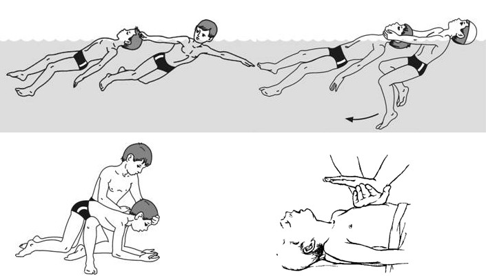 Если пострадавшего извлекли из воды без сознания, надо, прежде всего, удалить изо рта и глотки ил, слизь и рвотную массу, а затем воду из дыхательных путей и желудка. Для этого его кладут грудью на колено тому, кто оказывает помощь, таю, чтобы голова свисала и была ниже грудной клетки. Затем каким-то куском ткани очищают рот и глотку. После энергичными движениями надавливают на спину, добиваясь сжатия грудной клетки. Таким путем удаляют воду из легких. После этого, уложив его лицом вверх и укутав, делают искусственное дыхание, а при отсутствии сердцебиения — наружный массаж сердца. Обе процедуры надо проводить одновременно, а не чередуя одну с другой.