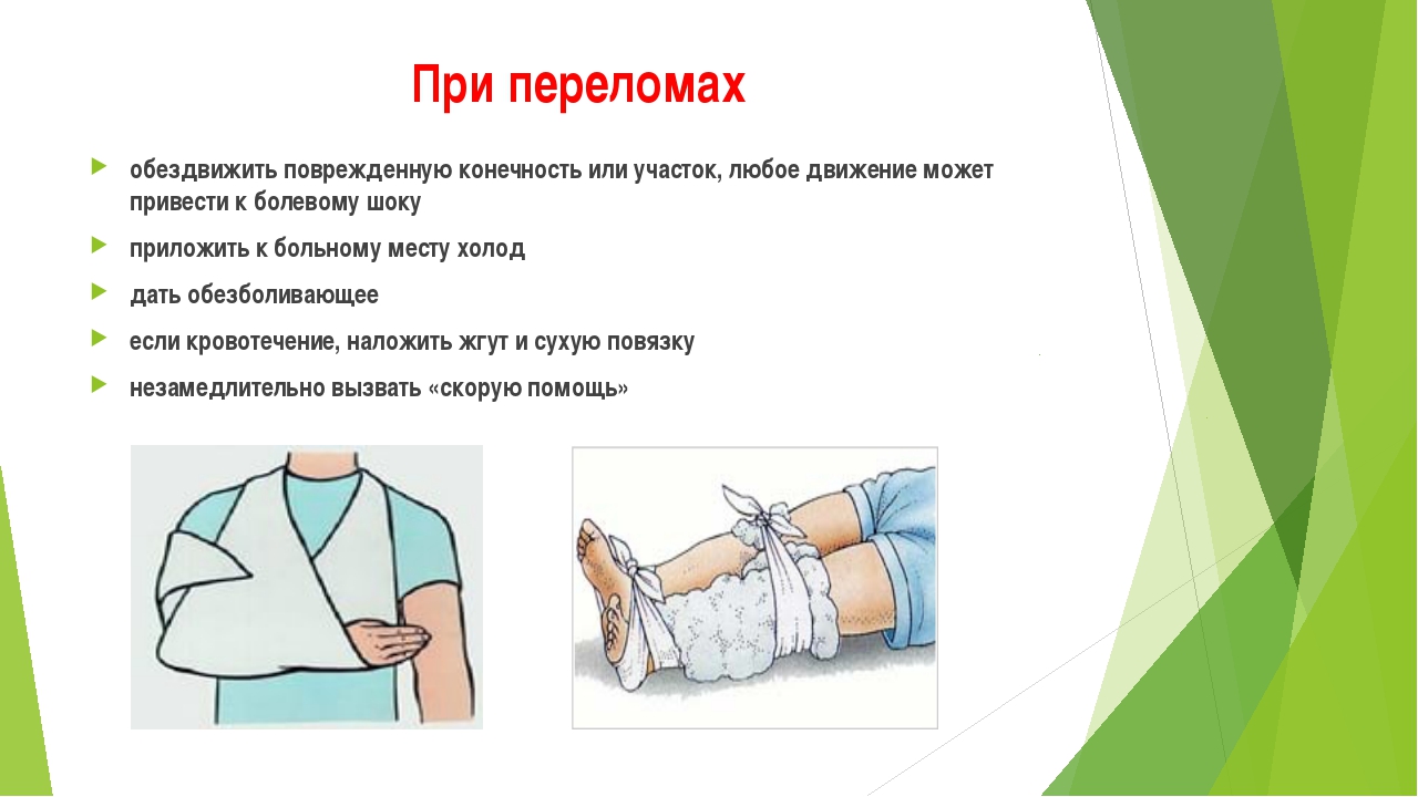 Первое, что необходимо сделать при переломе, — это создать неподвижность костей в месте травмы. Для этого используют шину из подручного материала: досок, палок, пучков прутьев, камыша или соломы и т. д. Ее накладывают таким образом, чтобы обездвижить два сустава — выше и ниже места перелома. Шину накладывают не прямо на кожу — обязательно следует сделать мягкую прокладку из полотенца, одежды и т. п. При. открытом переломе рану предварительно обрабатывают йодом и накладывают антисептическую повязку. На место закрытого перелома полезно дать холод. Ни в коем случае не следует пытаться поставить кости «на место» ни при открытом, ни при закрытом переломе. При такой попытке велика возможность поранения крупных сосудов, нервов, мышц острыми краями кости. Чтобы этого не произошло, собственно, и накладывается шина. При отсутствии подручного материала для шины поврежденную руку просто прибинтовывают к туловищу, а ногу — к здоровой ноге. После этого надо давать болеутоляющие средства (анальгин и т. п.) и организовать доставку пострадавшего в медпункт.