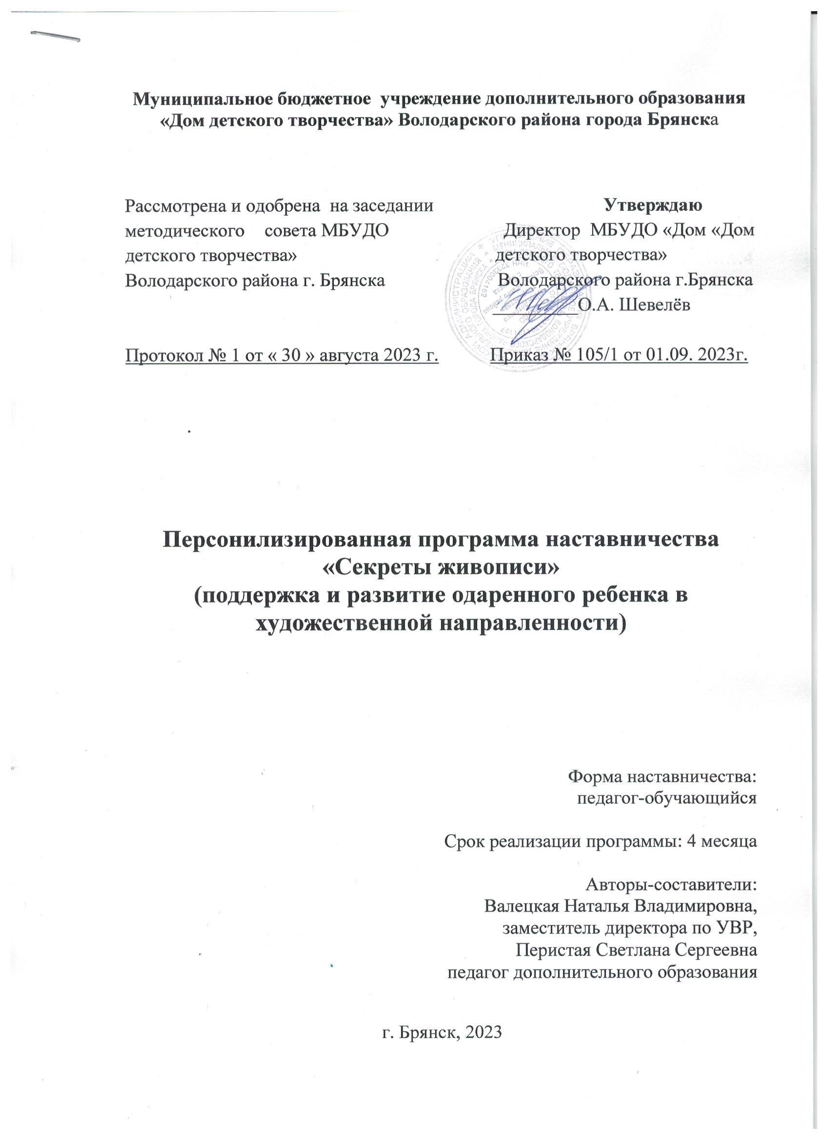 Персонализированная программа наставничества «Секреты живописи» (далее-Программа) направлена на раскрытие потенциала одаренного ребенка и возможности его развития. Значимая роль в реализации детского таланта принадлежит наставнику-педагогу. Наставник художественной направленности передает наставляемому-обучающемуся не только свои знания и свой опыт, но и учит видеть красоту окружающего мира. Наставник становится значимым для ребенка в процессе обучения и воспитания.