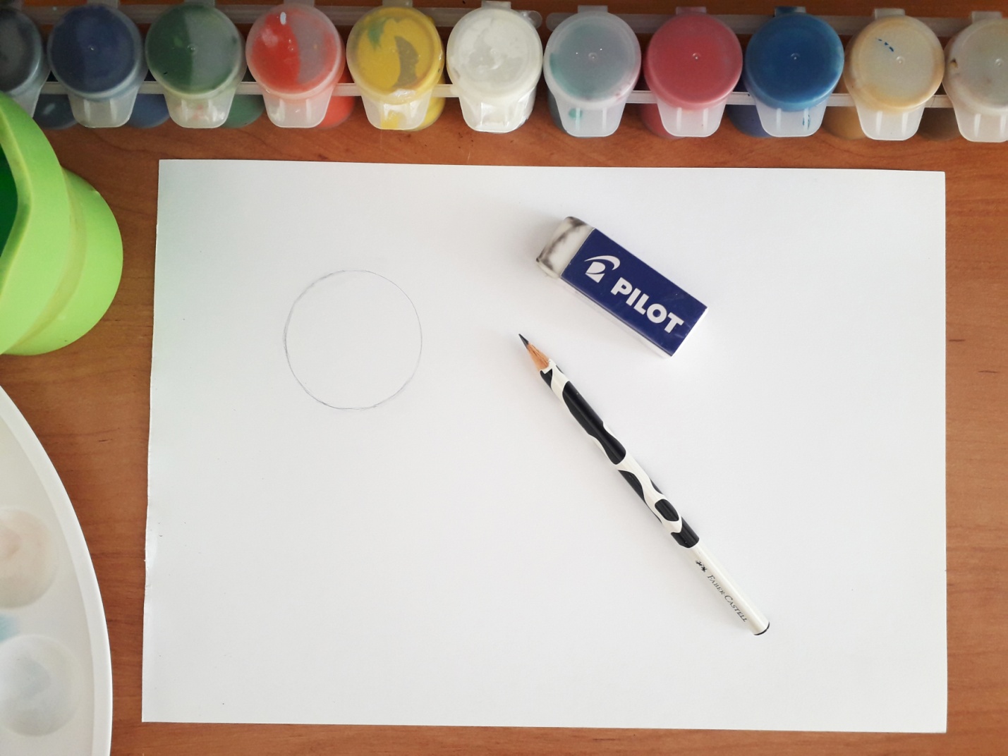 Начинаем с того, что недалеко от верхнего левого угла листа при помощи подручных средств рисуем карандашом круг. Рис 1.