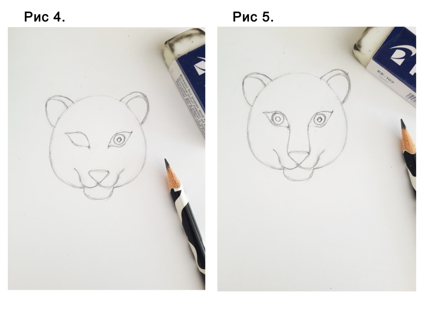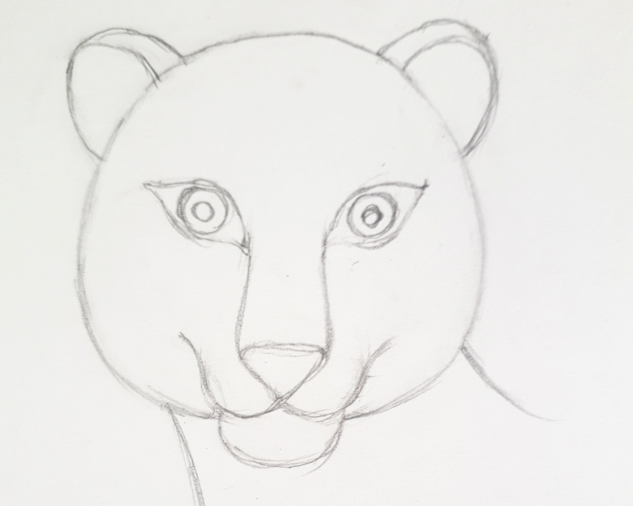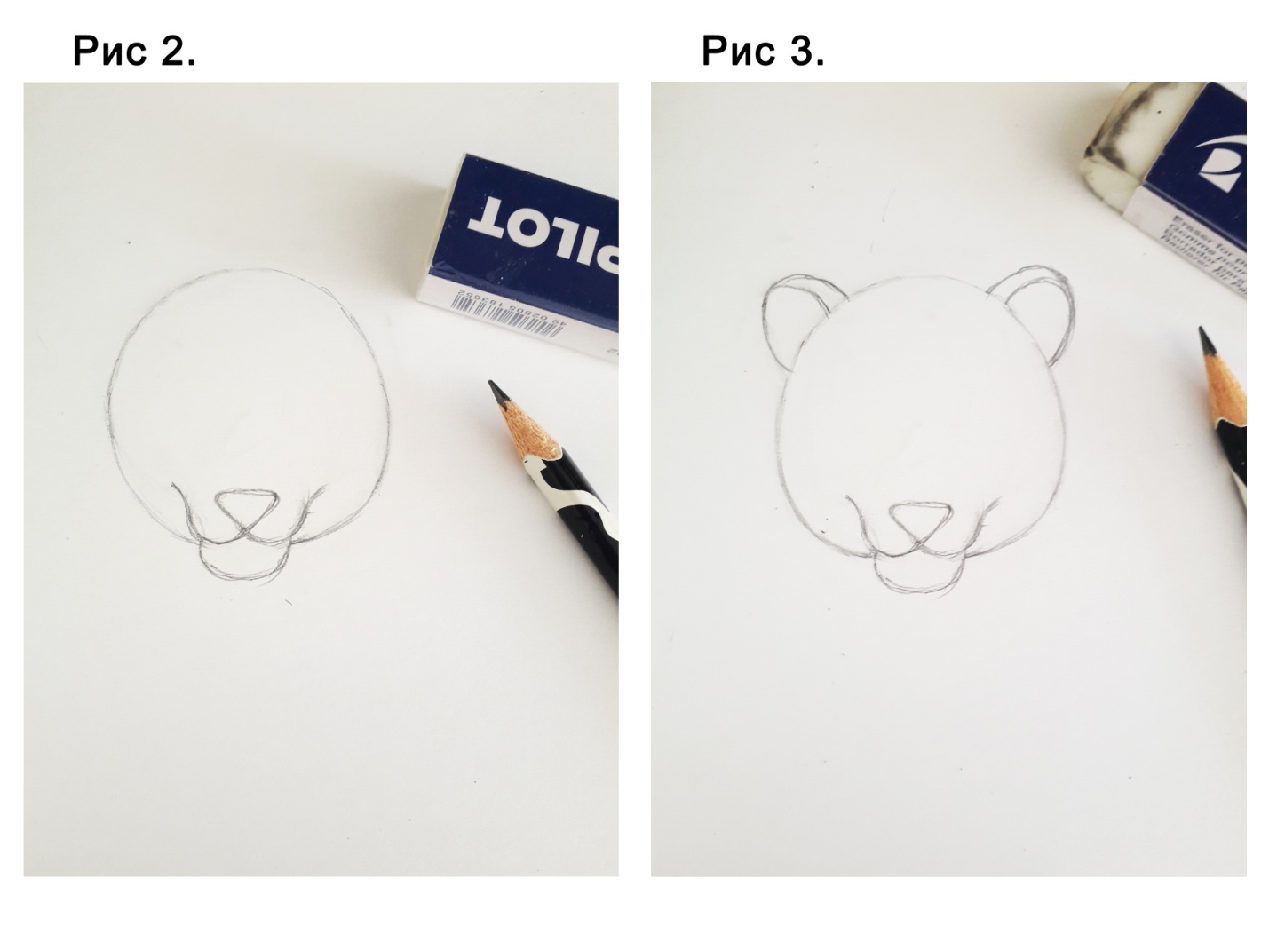 Потом подрисовываем мордочку – носик, щёчки и подбородок. И у круга пониже расширяем объём, т.к. мордочка у животного не ровная как круг. Рисуем ушки на макушке. Рис 2 и Рис 3.