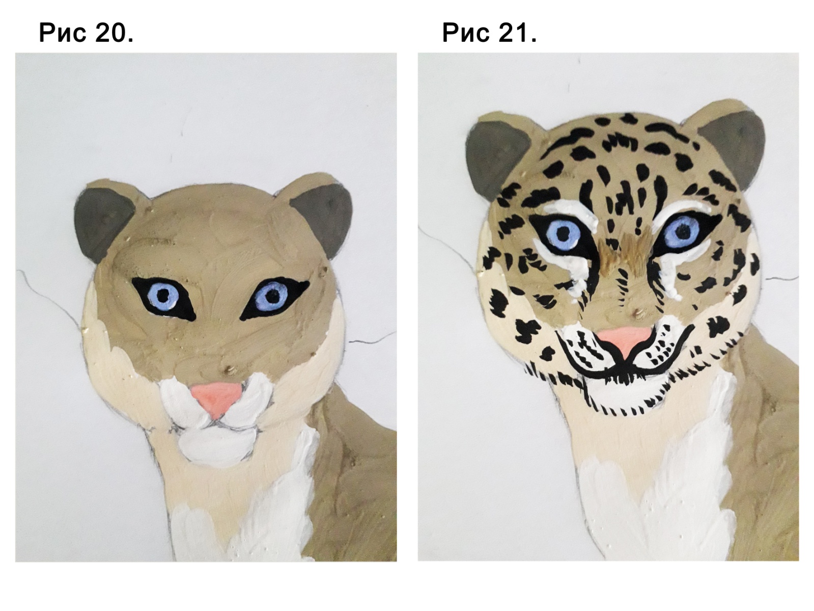 Радужную оболочку глаза раскрашиваем синим с белым. Зрачки чёрным. Не забываем, что мелкие детали в картине рисуем тонкой кистью. Потом на мордочке рисуем пятнышки чёрным цветом, характерные линии. Для точного воспроизведения можно смотреть на фото снежного барса. И белым цветом добавляем линии сверху и снизу глаза. Рис 20 и Рис 21.