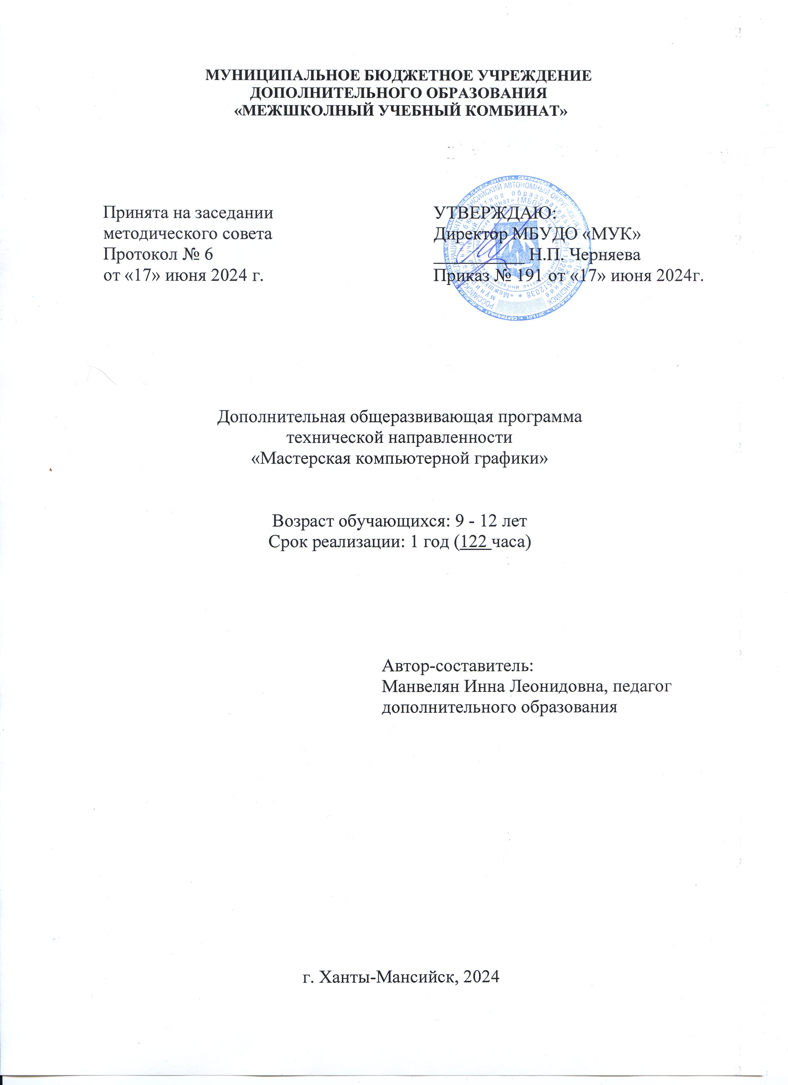 Принята на заседании методического совета Протокол № ___ от «__» ______________ 20__ г. | Утверждаю: Директор МБУДО «МУК» __________ Н.П. Черняева Приказ № ___ от «__» ______ 20__ г. |