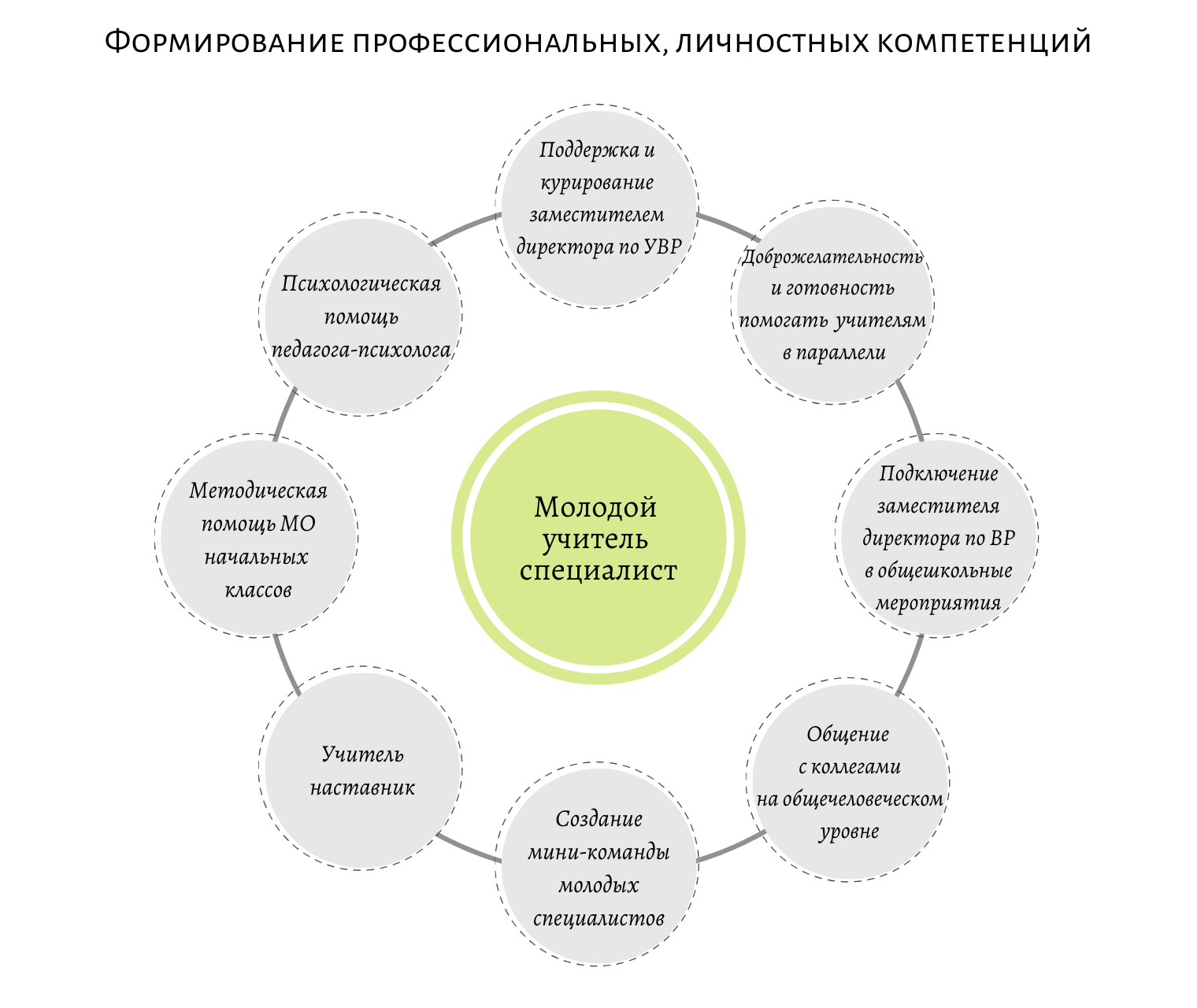 Активное включение молодых специалистов в образовательное поле школы, вовлечение их в совместную работу (разработку программ, грамотное применение государственных программ, соблюдение образовательного минимума, адаптация молодого специалиста в образовательном пространстве), наличие прямой и обратной связи управленческой информации, обучение ориентироваться в потоке методической информации, бережное формирование авторского, личного профессионального опыта будет формировать непредметные, надпрофессиональные компетентности специалиста, в частности: «мягкие навыки», «ключевые компетентности», умения комплексного многоуровневого принятия решений в профессиональной области, креативность, способность к творческому поиску, нестандартному решению педагогический кейсов, сотрудничеству с другими (коллегами, руководством, родителями, обучающимися, внешними партнерами).