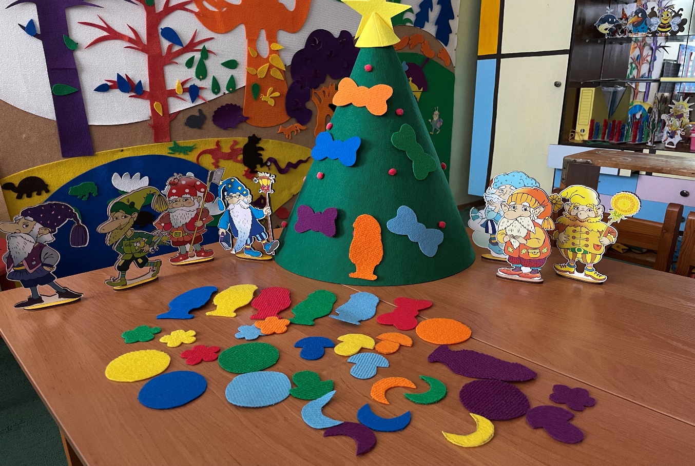 Игра «Наряди ёлочку в свой цвет» (цвет гномика) – Детки выбирают игрушки и украшают ёлочку в цвет гномика, который пришёл в гости (с добавлением других гномов).
