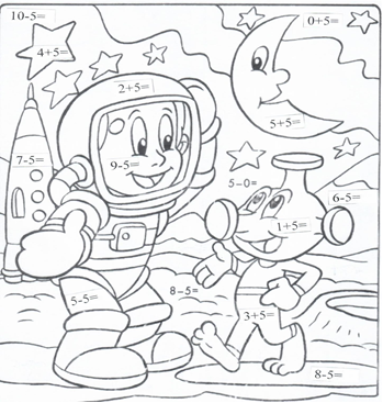 - В нашей космической раскраске есть примеры: 3 + 5 = 8; 6 – 5 = 1.