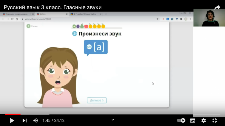 4. Освоение нового учебного материала (7 минут) | Формирование новых знаний и умений | - Сегодня мы с вами узнаем о гласных звуках. Учитель выводит на экран страницу урока русский язык 3 класс на платформе Учи.ру. https://youtu.be/iUGhd59bozY (Просмотр с 0:20 до 7:20) | Смотрят.