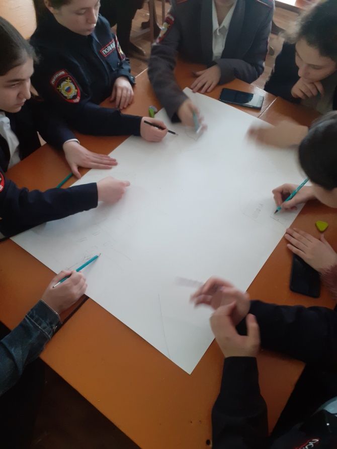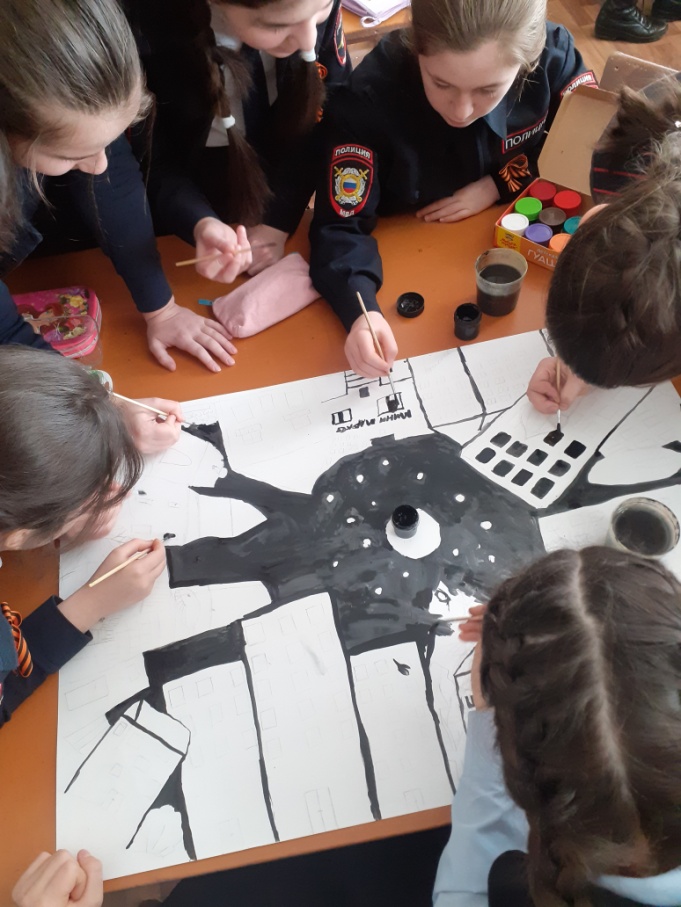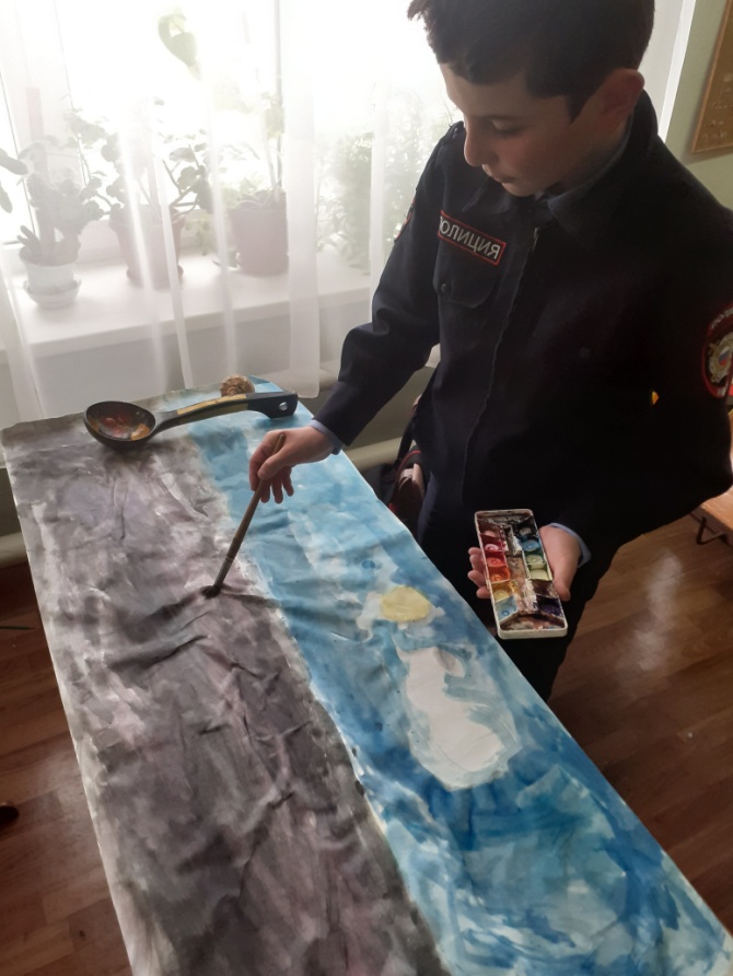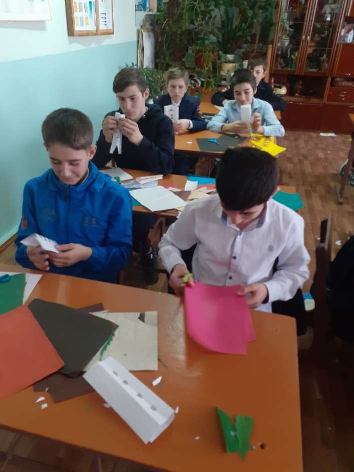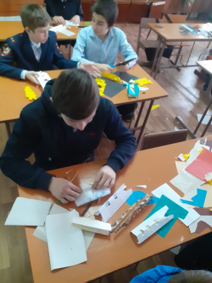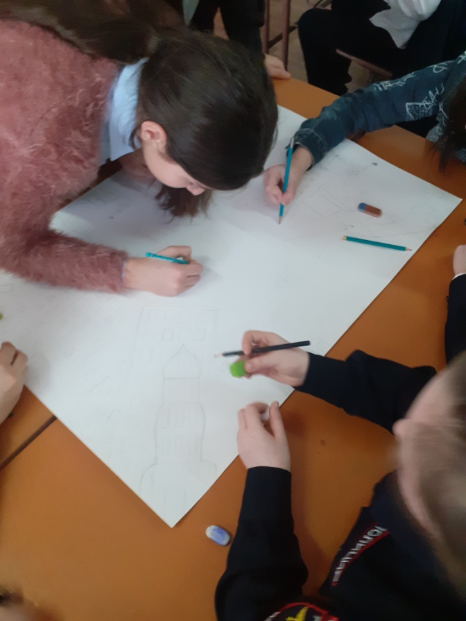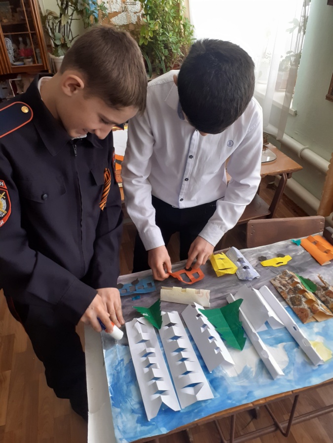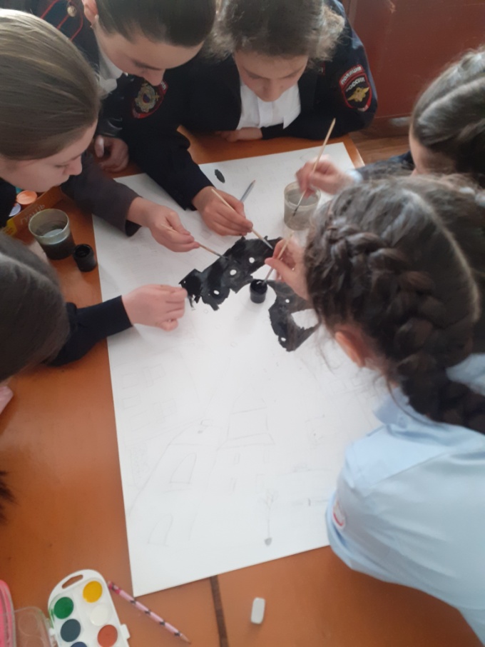 После того, как темы выбраны, учащиеся 1 группы разделяются: одни расписывают фон для общей композиции, другие делают макеты зданий и сооружений, транспорта, деревьев.. Затем детали раскладывают на готовом фоне, формируя композицию, приклеивают и работа выполнена.