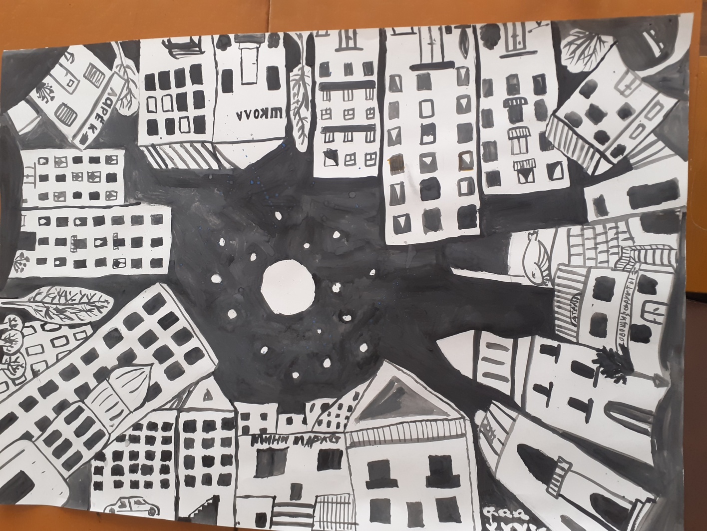 Вторая группа работает на листе ватмана. Сначала находят центр листа и рисуют круг – луну. Затем рисуют дома группами по каждой из четырёх сторон листа и в углах. Группы домов рисуют вертикально, форму домов можно немного искажать. Маленькими кружочками обозначают на небе место под звёзды. Затем закрашивают небо чёрной тушью или гуашью, оставляя звёзды и луну. После прокрашивают группы домов.