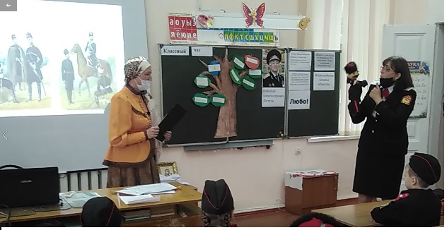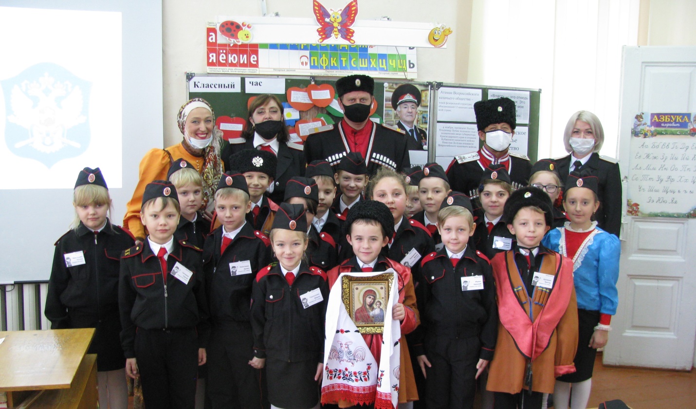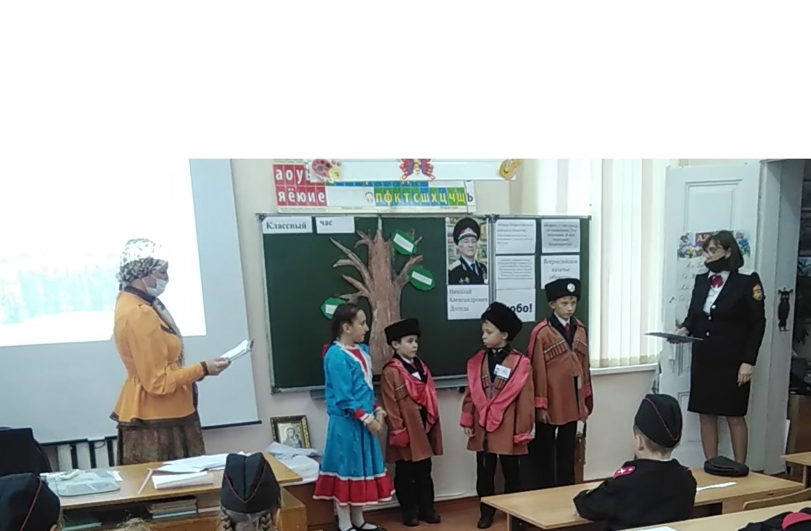 Классный руководитель приветствует гостей, наставника класса представителя родительского комитета и атамана станицы.