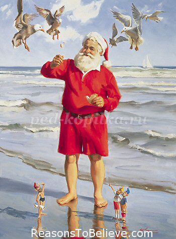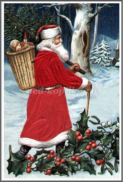 В Америке новогодний дед — Санта Клаус — носит коротенькую красную курточку и забавный колпачок на голове. Путешествует он по воздуху на оленьей упряжке и проникает в дома малышей через каминную трубу.