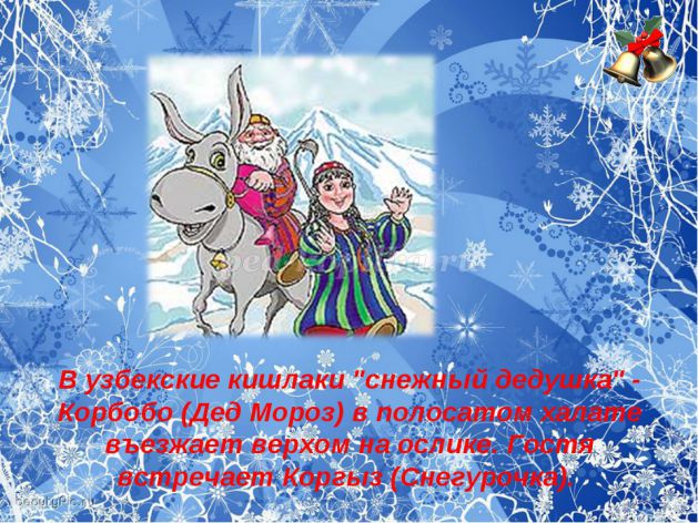 От Йоулупукки не отстаёт узбекский снежный дедушка Корбобо, который в полосатом халате развозит малышам подарки верхом на ослике. Сопровождает его снегурочка Коргыз.