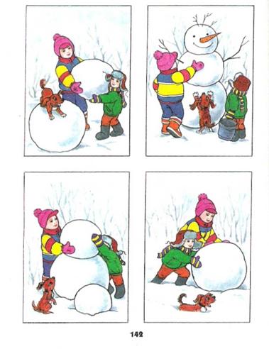 Продолжать учить детей узнавать изображения зимних игр на природе, составлять рассказ по серии сюжетных картинок;