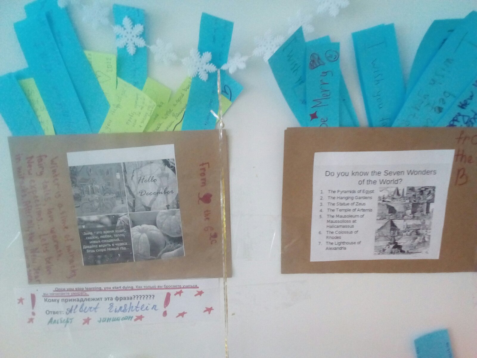 Скоро приближается Рождество в англоговорящих странах. Англичане, американцы, канадцы отмечают этот светлый праздник 25 декабря. В преддверии Рождества и Нового года среди 6-7 классов на уроках английского языка было организовано интерактивное занятие «Iwishyou…». Ребята под руководством учителя …. создали конверты с добрыми пожеланиями на английском языке, устроили «мозговой шторм» по переводу пожеланий с русского на английский язык, познакомились с изречениями известных деятелей Англии и Америки. На уроке удалось отработать грамматический и лексический материал с помощью анализа песни «Snowman» и английских стихов. Каждый желающий может вытянуть «полосочку» с добрыми словами и при желании оставить свое послание на английском языке прямо на двери класса https://sch226.ru/
