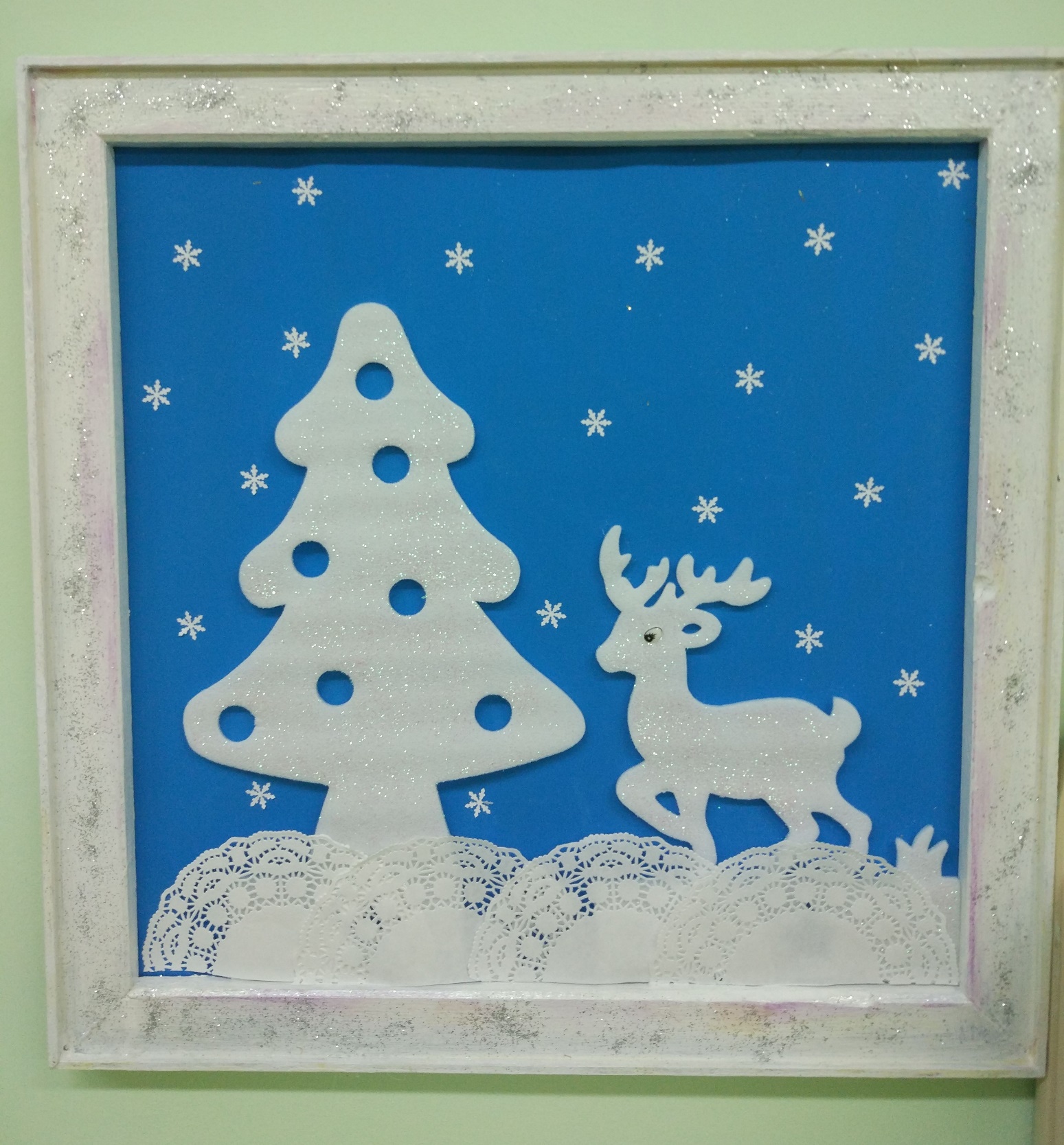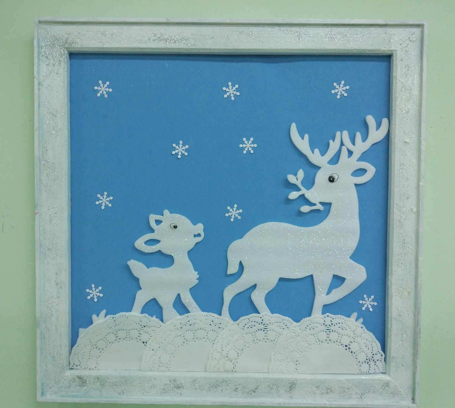 Мы покрасили рамки, украсили их блестками, натянули голубой фоамиран в качестве фона, разместили в рамках композицию из оленей (блестящий фоамиран). Сугробы сделаны из кружевных бумажных салфеток. Снежинки изготовлены с помощью фигурного дырокола. К новому году картины были украшены гирляндами. Детям в группе очень понравилось!