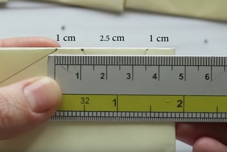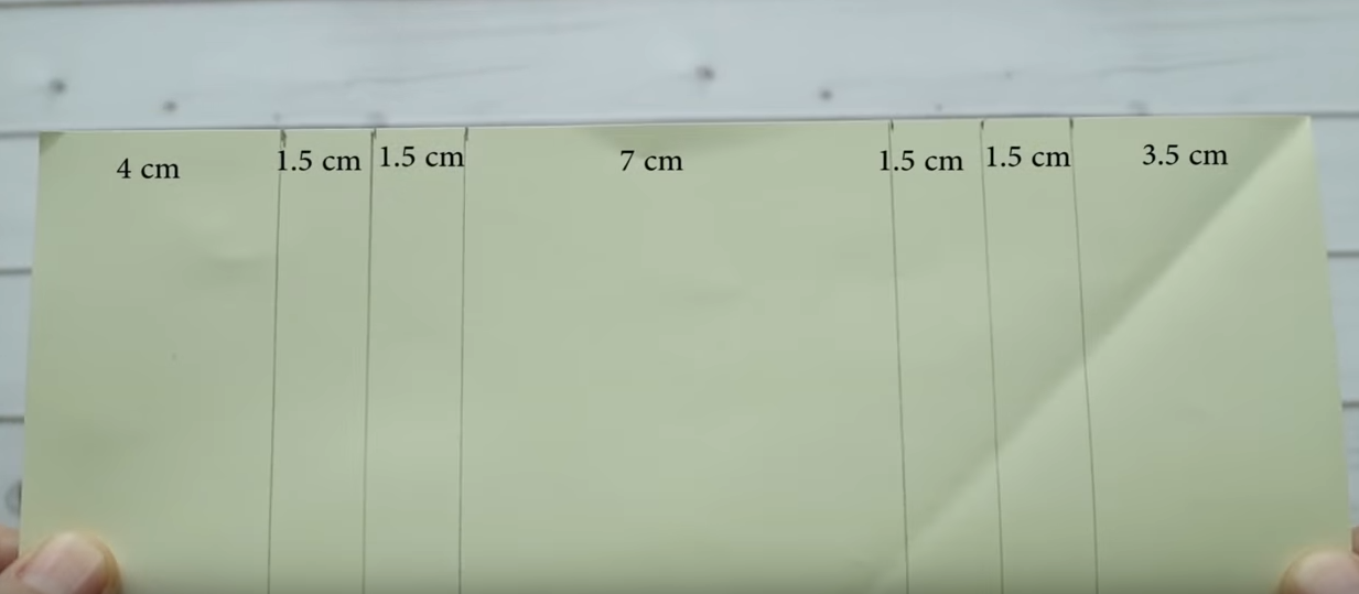 Отступаем от края 4см ставим метку, от метки отступаем 1,5 см и опять ставим метку от неё отмеряем ещё 1,5 см и снова ставим метку. Отступаем 7 см -метка, отступаем 1,5 см - метка, ещё раз 1,5 см и снова метка. Затем соединяем верхние и нижние метки.