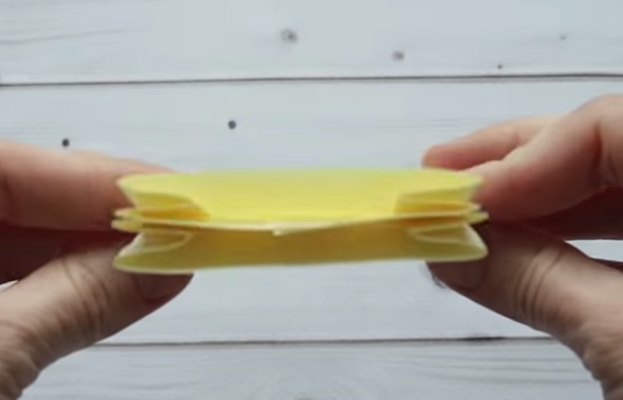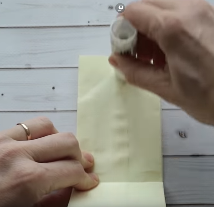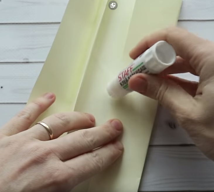 .Получившийся прямоугольник складываем пополам соединяя верх с низом. Затем разгибаем и промазываем клеем половину этого прямоугольника по середине узкой полоской, складываем и склеиваем.