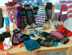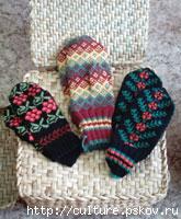 зорное вязание из шерсти - одно из немногих женских занятий довольно широко распространенное и поныне. Однако нас интересуют лишь те вязаные изделия, которые выполнены в местных традициях. Известный архитектор-реставратор, прекрасный знаток псковской старины, К.П. Спегальский в послевоенное время создал целую серию рисунков с традиционными узорами псковских варежек. Это было время, когда на Псковском рынке еще можно было купить глиняные игрушки, ручную керамику, мебель. Из традиционных видов вязания из шерсти сохранились только варежки. Мастерицы на протяжении многих лет сохраняют свои самобытные узоры вязания. Каждая мастерица знает с детства большое число рисунков, которые сама еще варьирует в каждой вещи. Узоры на варежках столь же значительны, как все орнаменты в народном искусстве. Стилизованные птицы, цветы, ромбы, кресты, треугольники, полоски в сложных сочетаниях, радующих глаз – это символы-обереги, переходившие от матери к дочери и пока сохранившиеся на теплых шерстяных «вязанках» псковских мастериц.