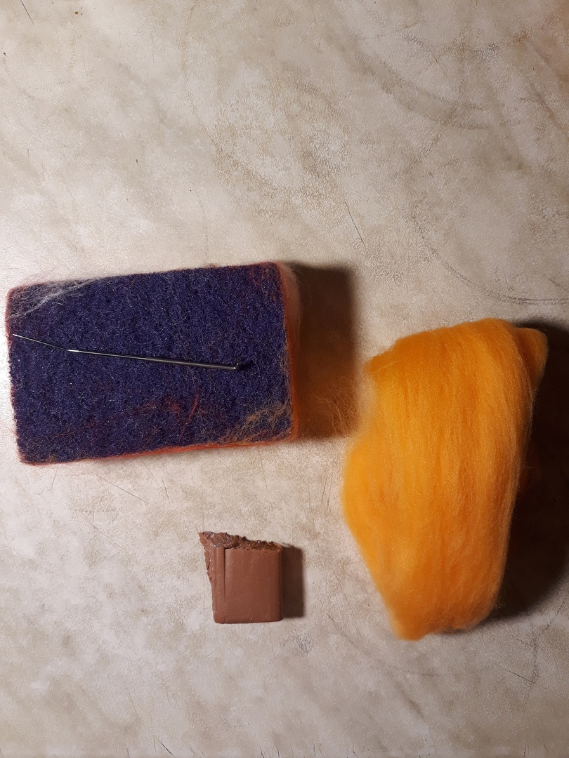 - кусок рыжей шерсти,иголка,губка,полимерная глина,клей.
