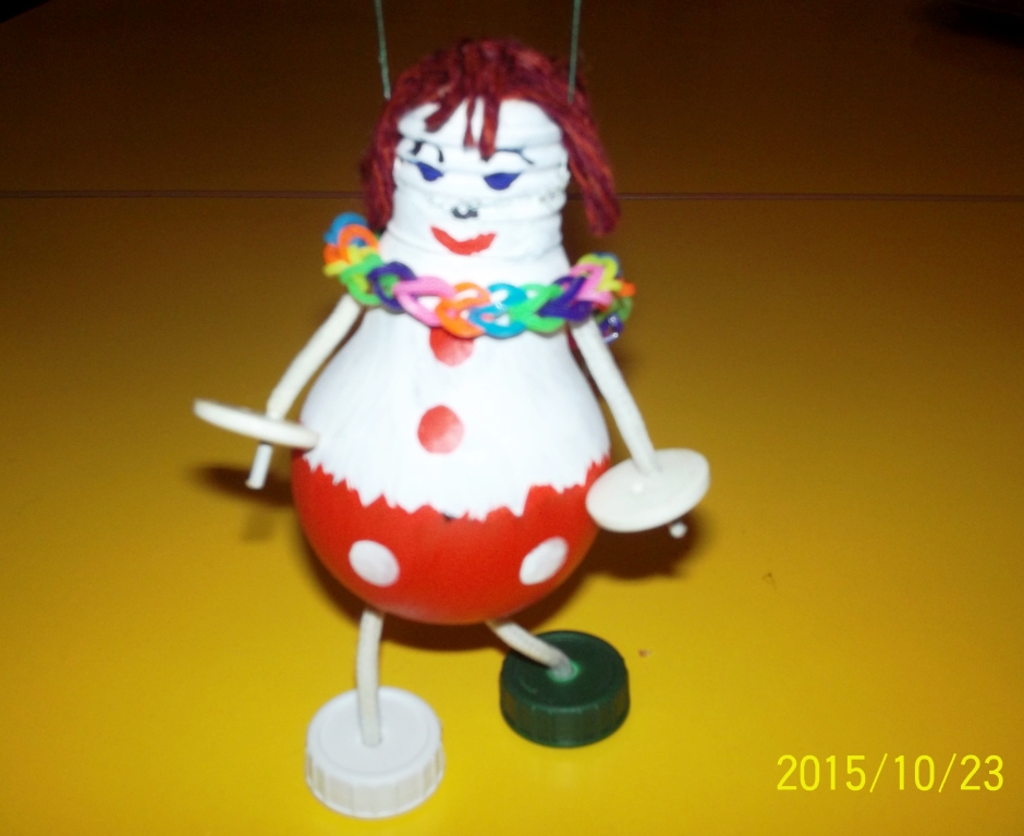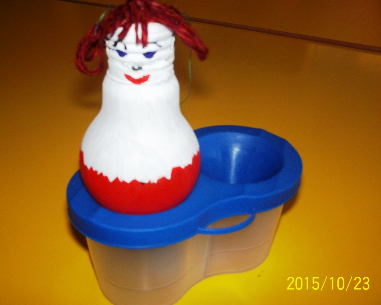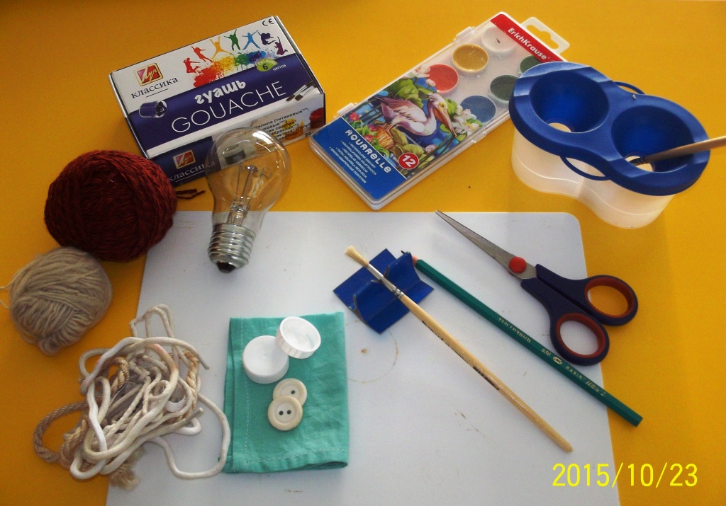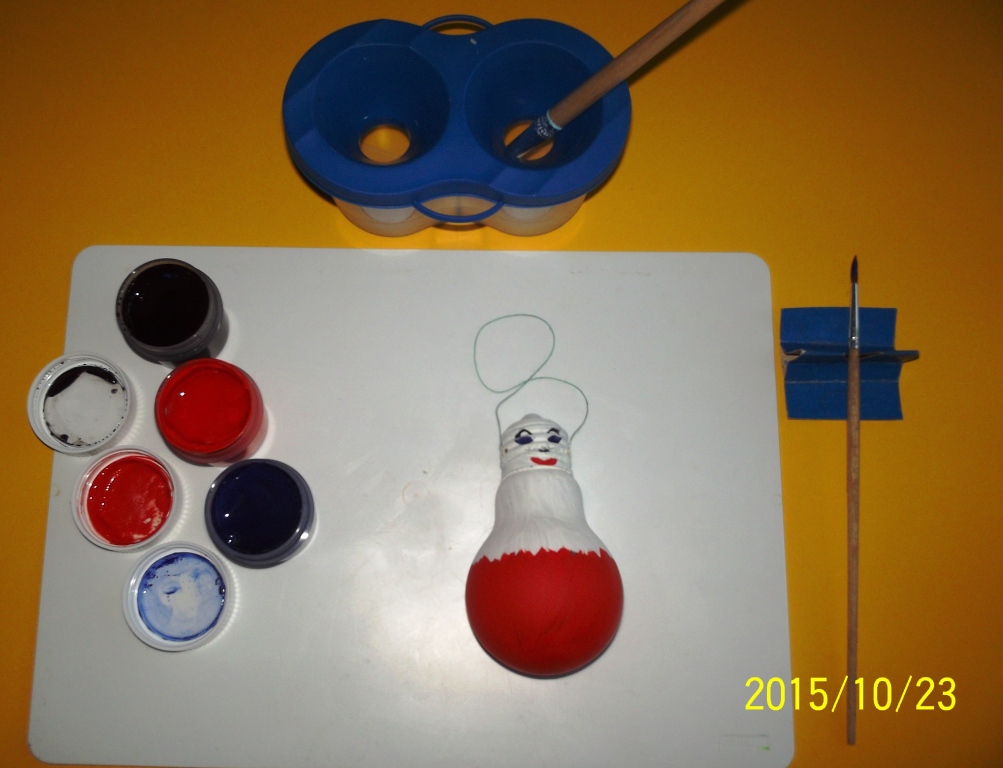 Мы предлагаем Вам сделать ёлочные игрушки – «Весёлых человечков» из подручного материала. Для этого нам понадобятся следующие материалы: использованная электрическая лампочка; цветная гуашь; шнурки; шерстяная пряжа; клей «Момент»; 2 пуговицы с большим отверстием; 2 пробки; ножницы; кисточки для клея и красок; вода в банке.