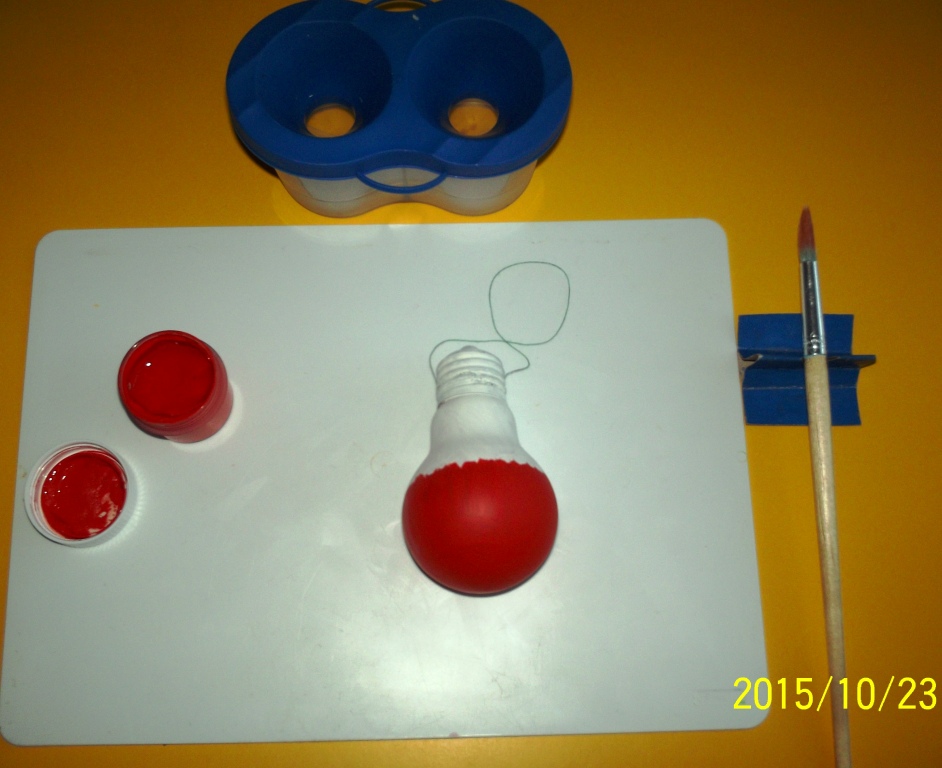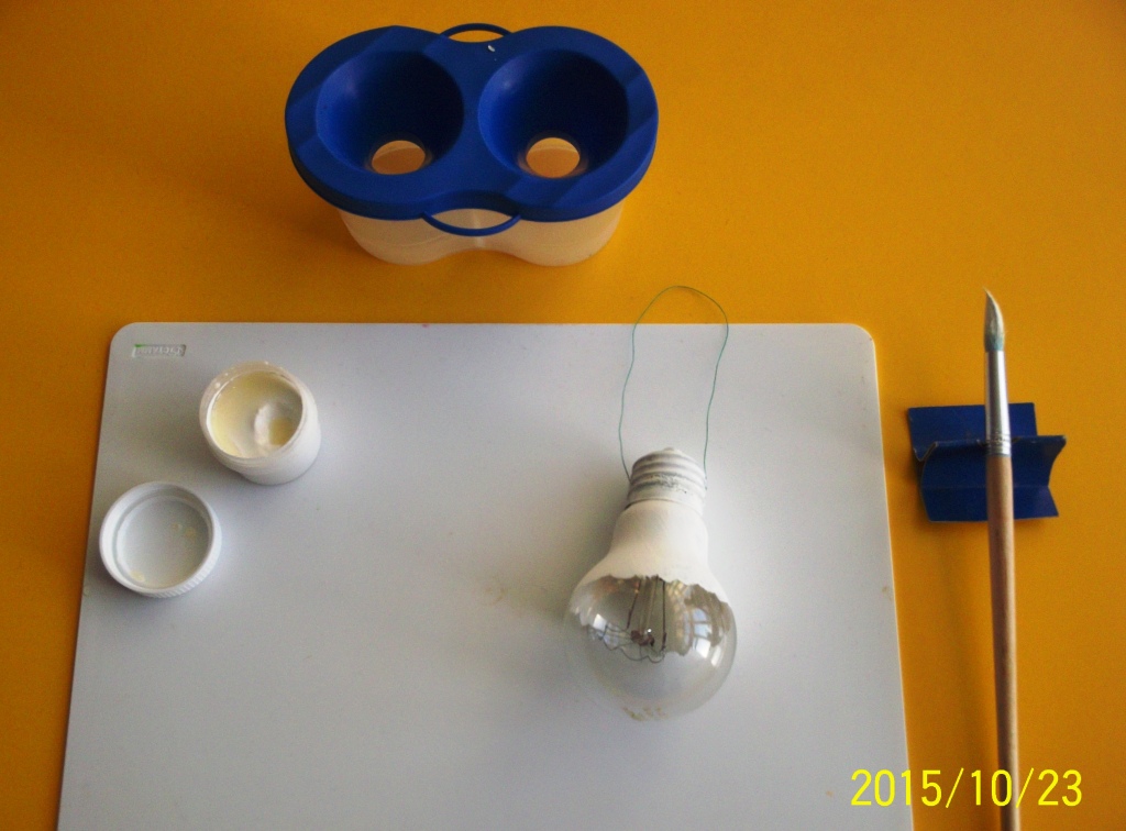 1 шаг: На цоколь лампы приклеиваем нитку или тесьму. Покрываем половинулампочки белым цветом, вторую – любым другим (по желанию).