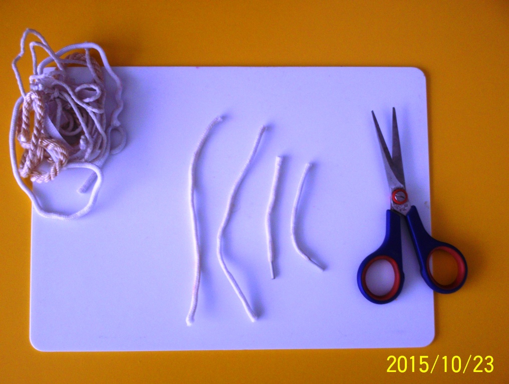 2 шаг: Готовим «руки» - «ноги» - отрезаем одинакового размера шнурки.