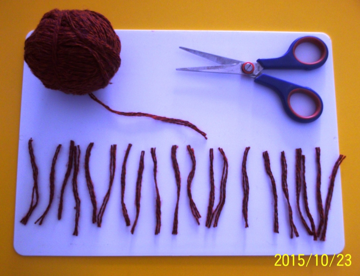 4 шаг: Готовим «волосы» для весёлого человечка – нарезаем шерстяных ниток одинаковой длины.