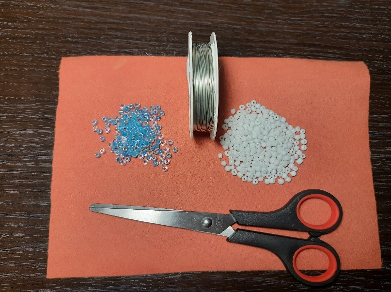 | Материалы и инструменты: - бисер белого цвета ~ 93 бисеринки, голубого ~ 77 бисеринок - проволока для бисероплетения диаметром 0,3 мм; - ножницы; - тканевая салфетка или фетр – подложка на стол для бисера. | |