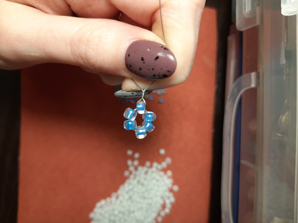 | Когда набрали 6 бисеринок. Нам необходимо пройти через одну первую бисеринку в колечко. Чтобы закрепить проволоку её необходимо скрутить пару раз. Кончиком, который короче пройти через пару бисерин и отрезать. | |