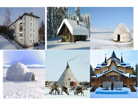 Слайд1 с пятью разными домами. Как вы думаете, какой их них дом Деда Мороза? Узнаём, что Его дом-это двухэтажныйтерем.