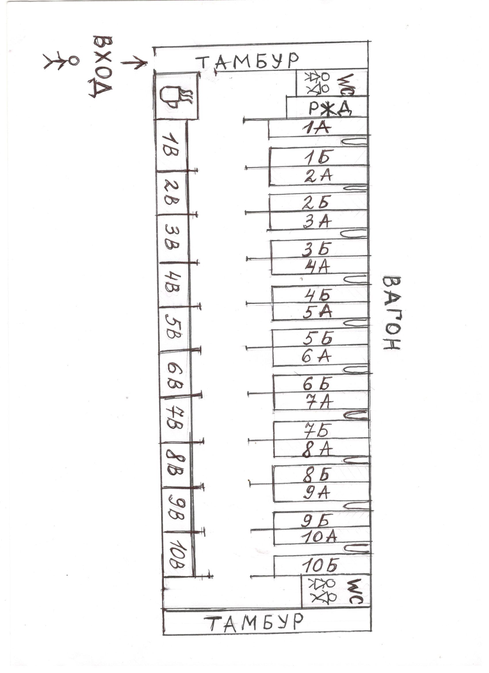 Перед вами схема вагона, в котором мы поедем. ( Распечатки у каждой пары на парте) Такой же большой формат А3 этого вагона на ватмане прикреплен к доске. Ваша задача найти свое место на схеме. Будьте внимательны, у каждого своя цифра, но кроме цифры у места есть еще буква – А, Б или В. Обратите внимание, что места с буквами А и Б находятся рядом друг с другом, а места с буквами В находятся сбоку. Дети 1 ряда выходят со стикером в руке, заклеивают на схеме у доски свое место. Потом 2 и 3 ряда. На ватмане вагон заполняется. Учитель последний заполняет стикером свое учительское место 1 В.