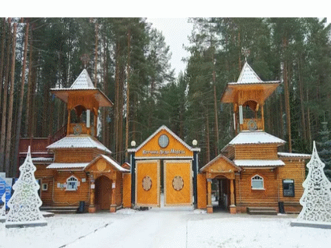 Слайд 2- крупно терем. Терем находится в сосновом лесу недалеко от г.Великий Устюг . У Деда Мороза есть своя вотчина – землевладение с разными постройками ,парком развлечений. Сегодня я предлагаю вам туда отправиться.