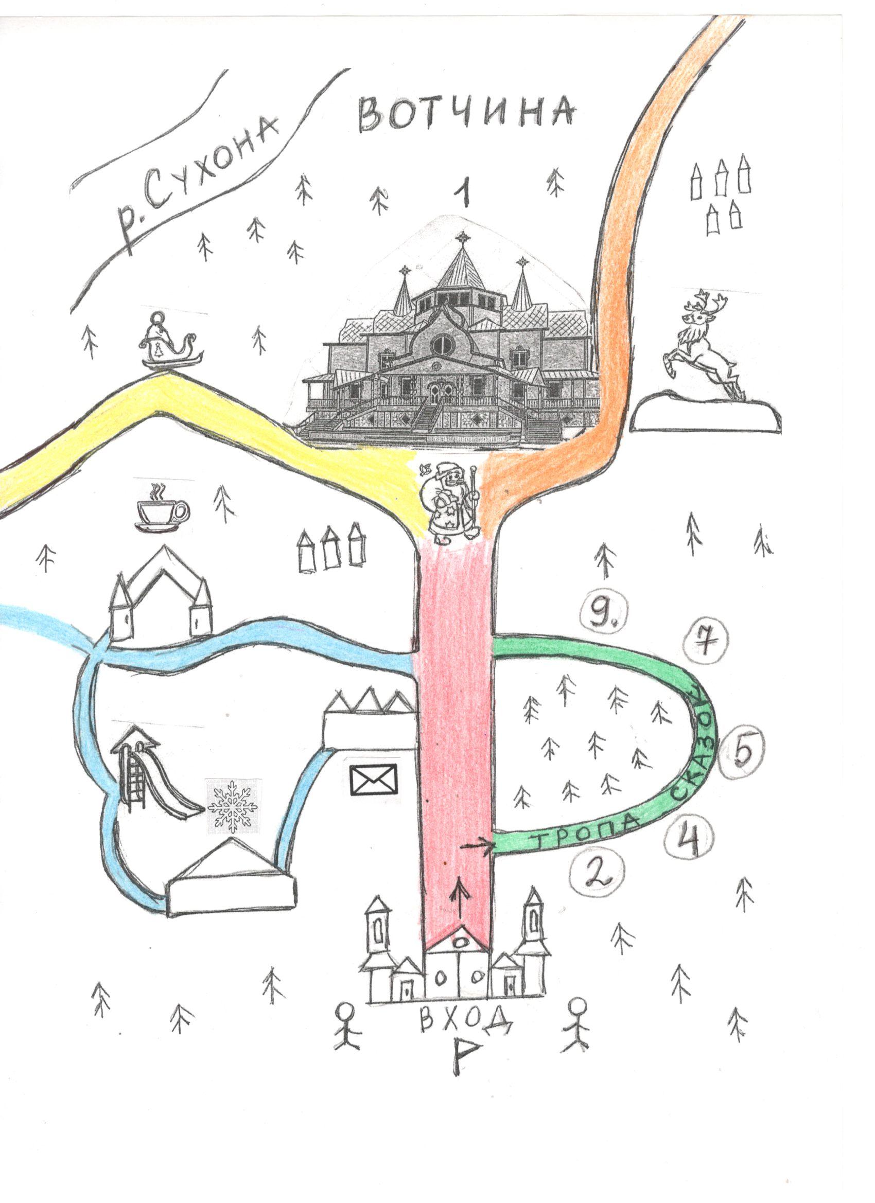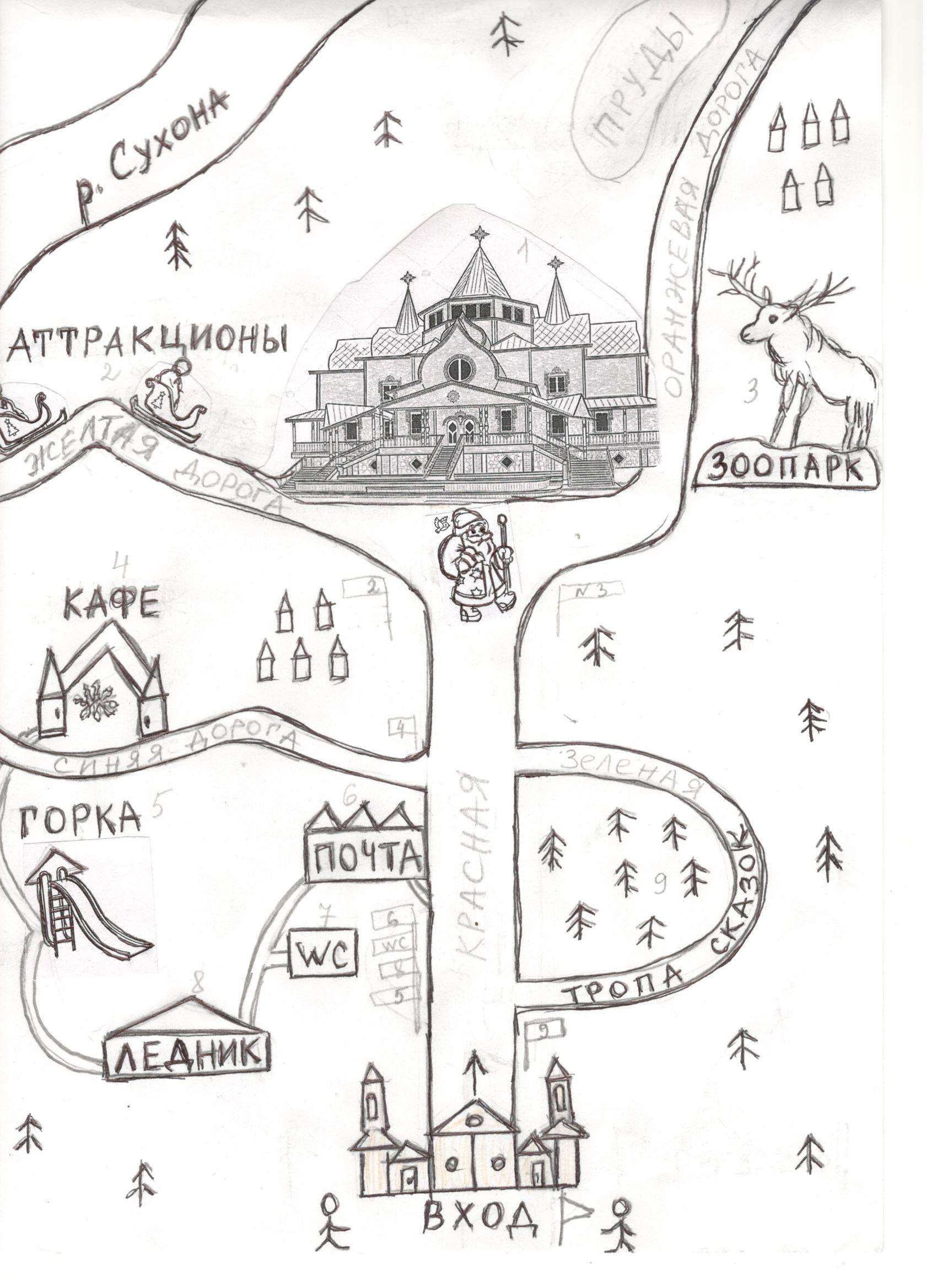 Рассмотрите схему Вотчины. (У каждой команды общий рисунок и Слайд 5 с таким же сканом рисука на доске). Найдите в центре листа терем Деда Мороза, он под № 1.